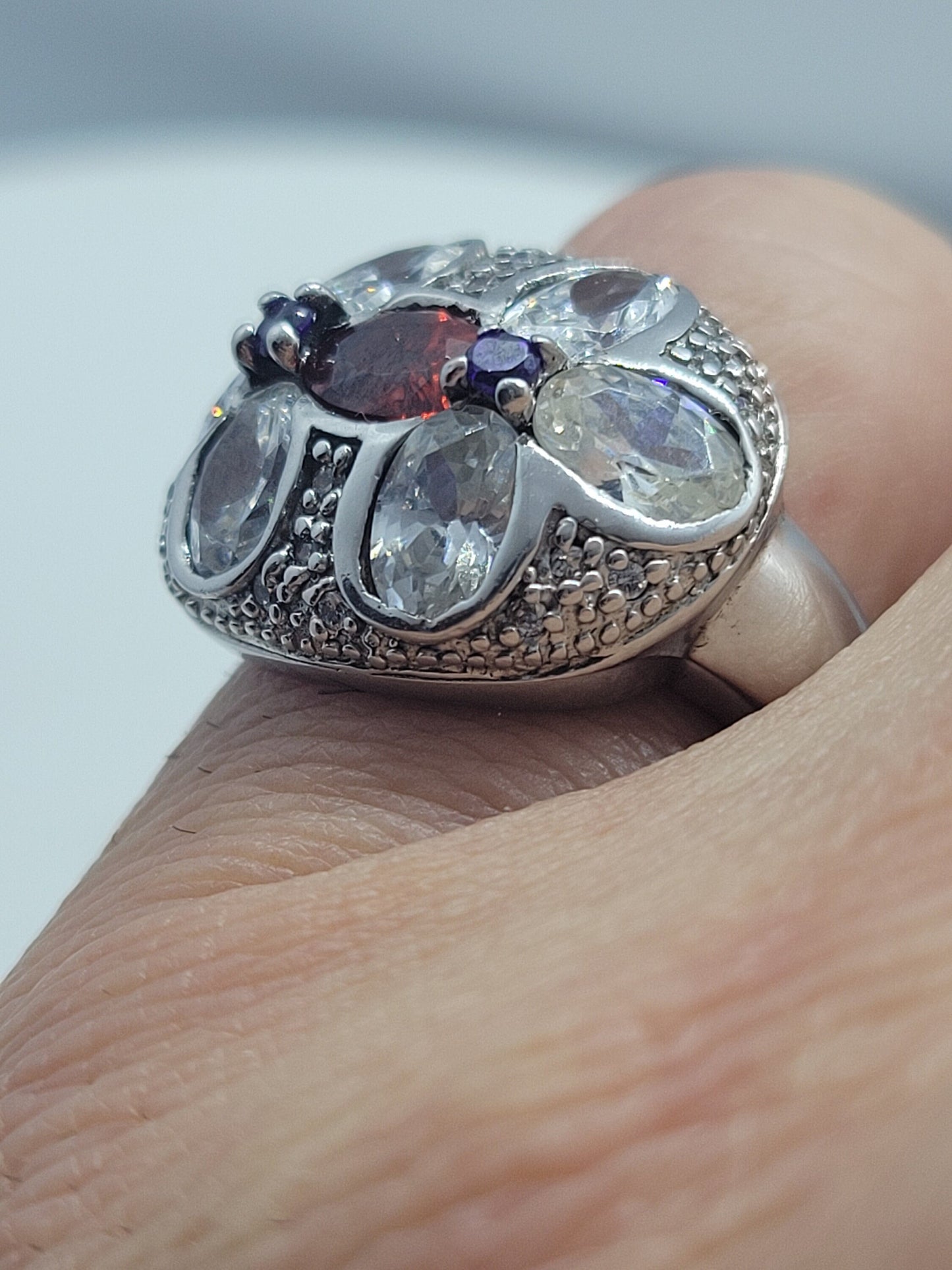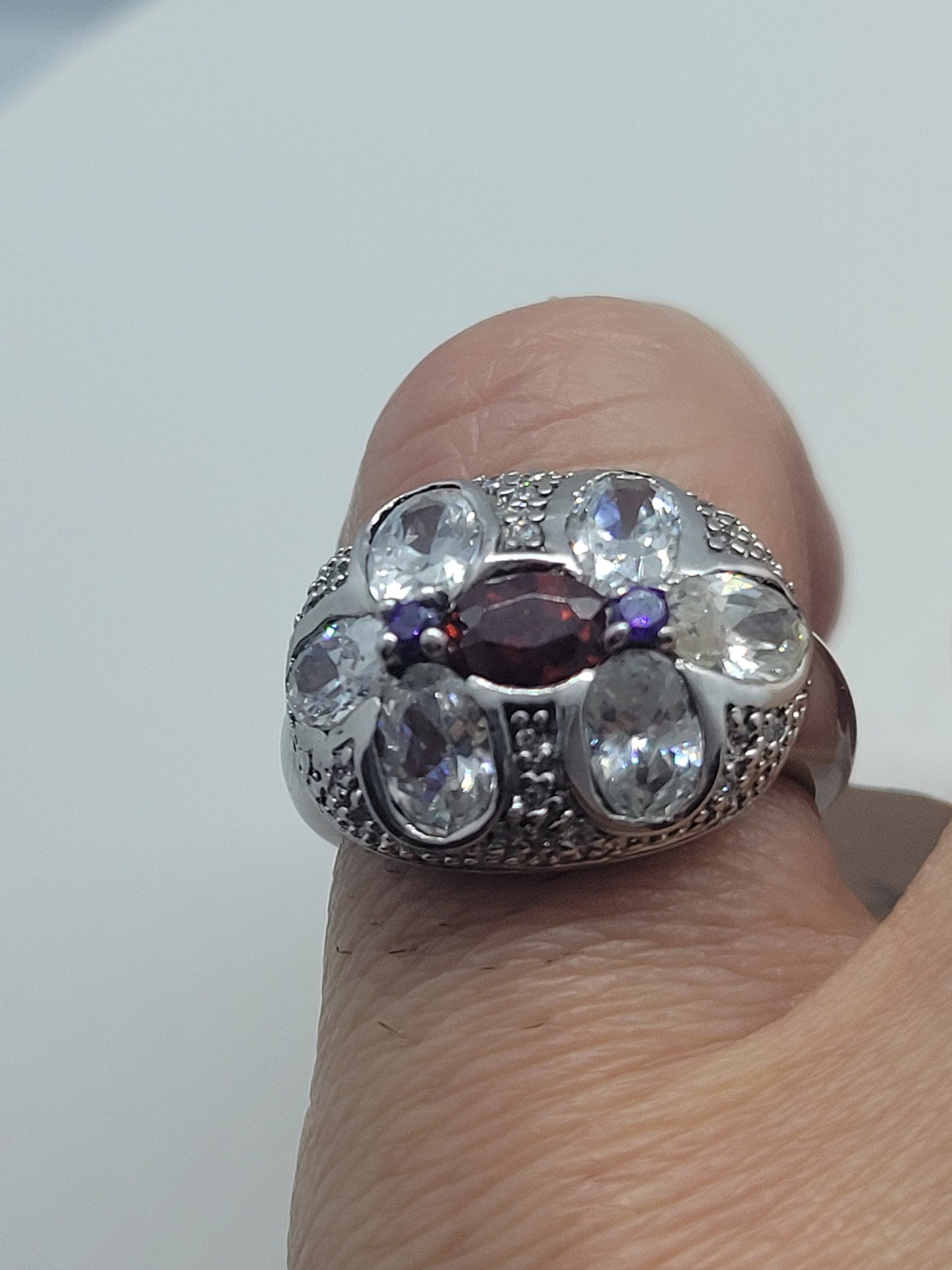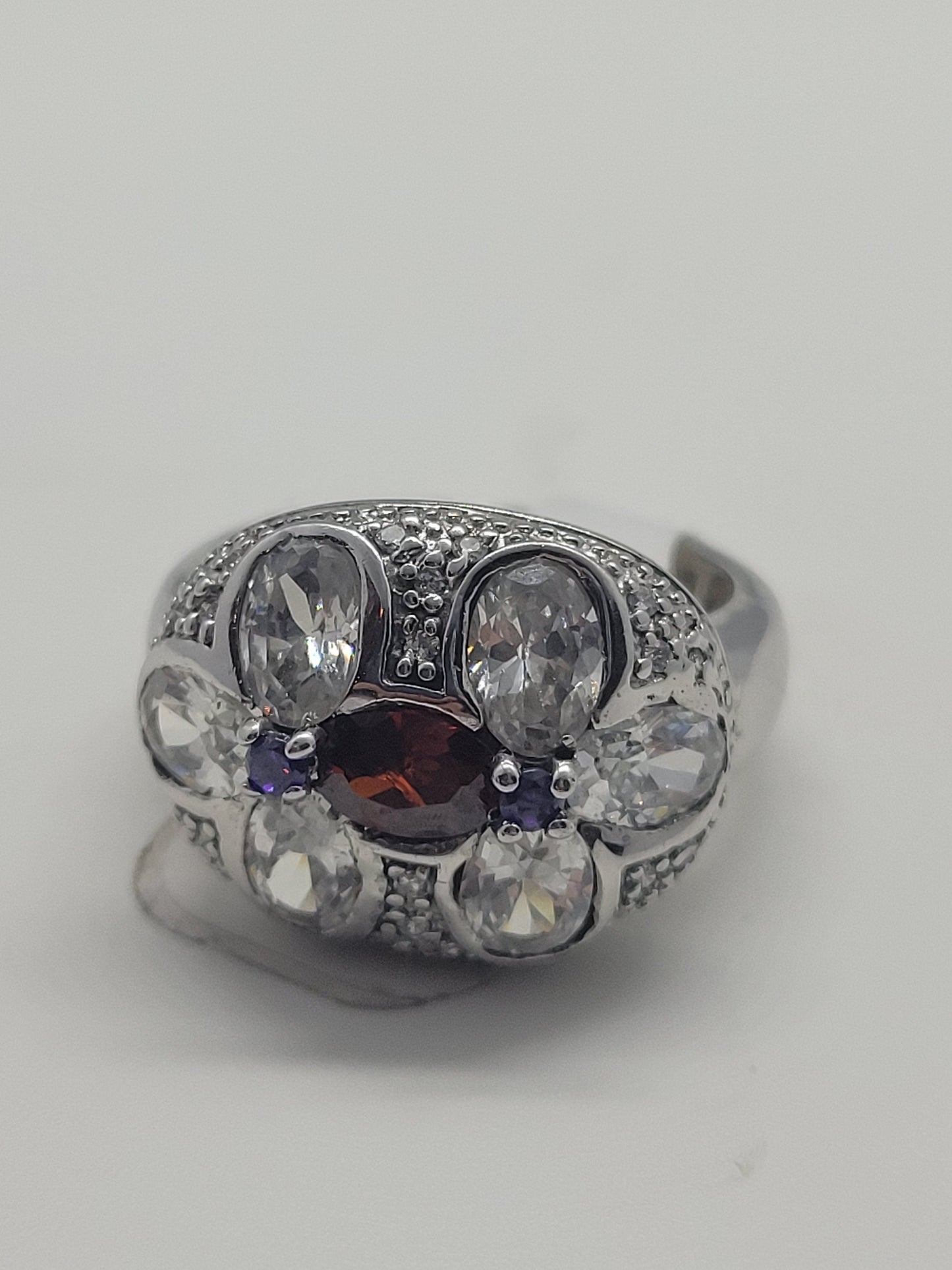 This is a vintage red garnet with purple amethist sidestones, surrounded by cubic zirconia ring set in 925 sterling silver.