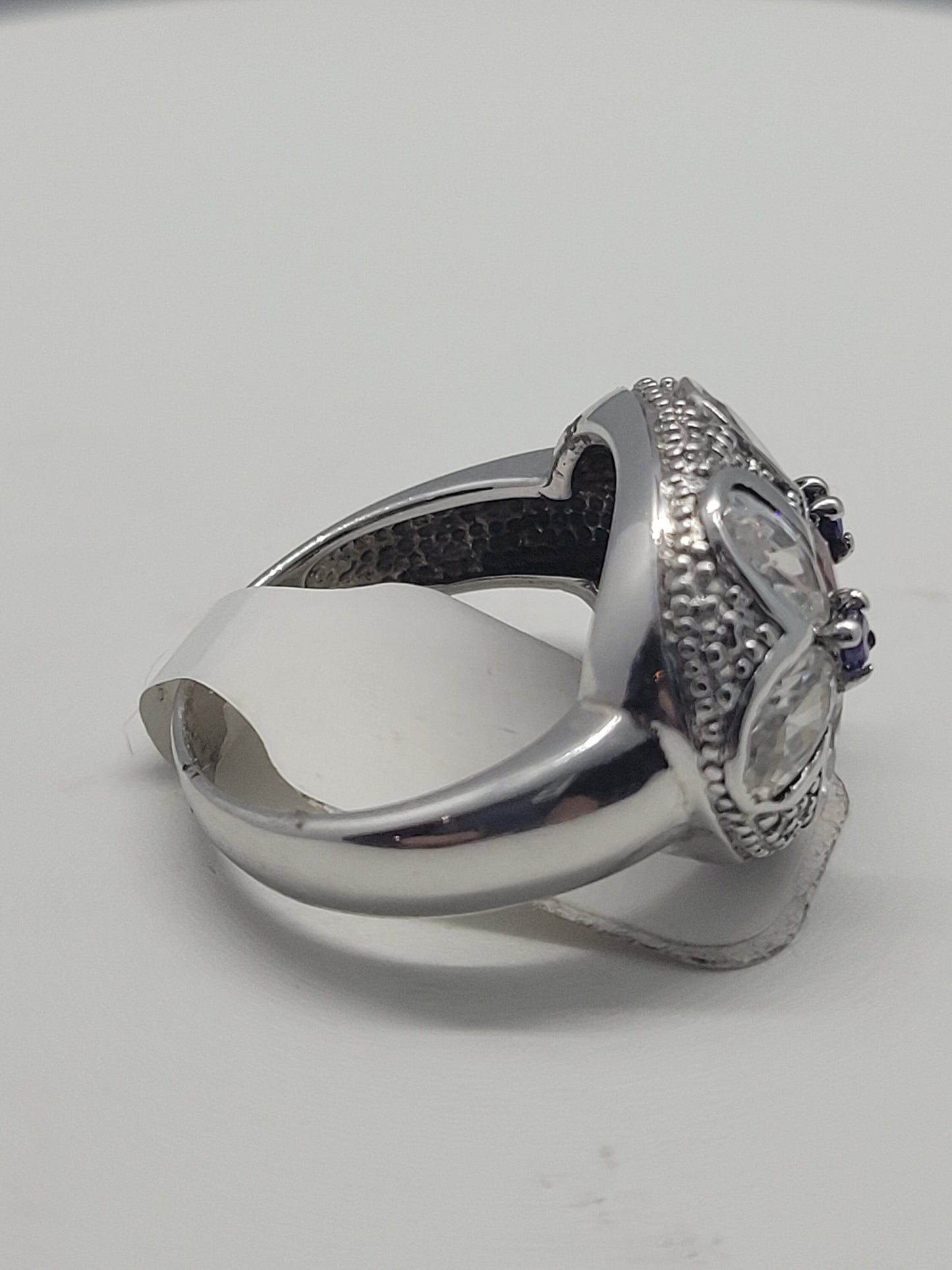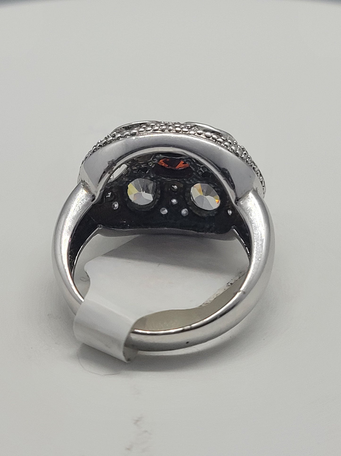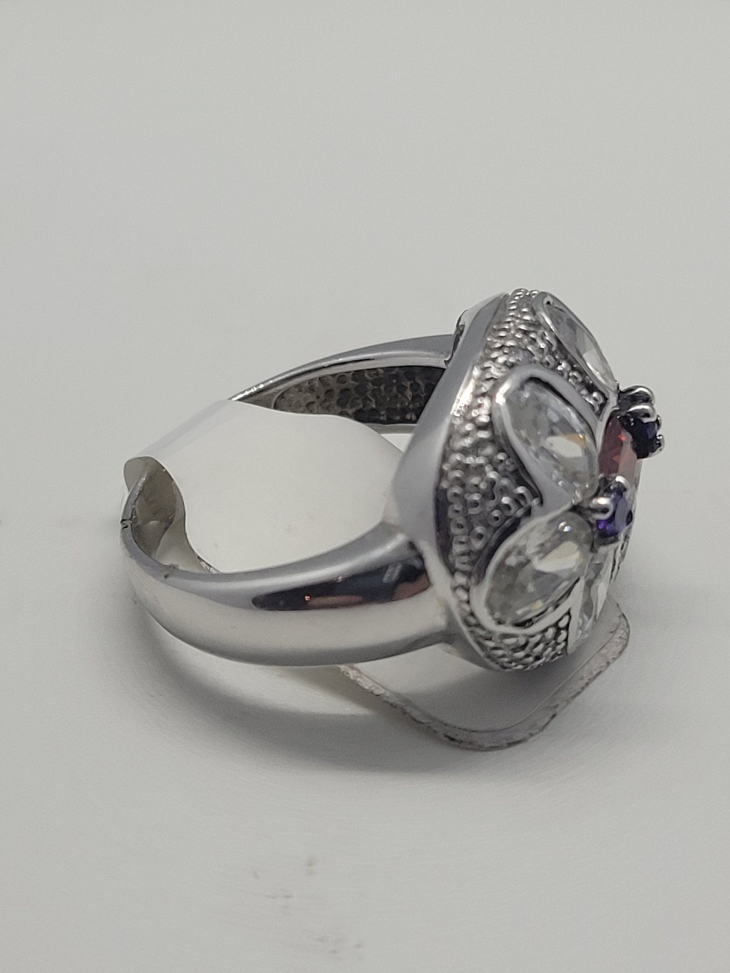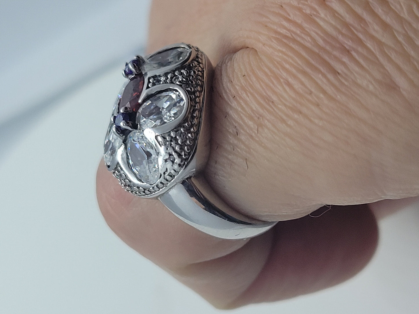 This is a vintage red garnet with purple amethist sidestones, surrounded by cubic zirconia ring set in 925 sterling silver.