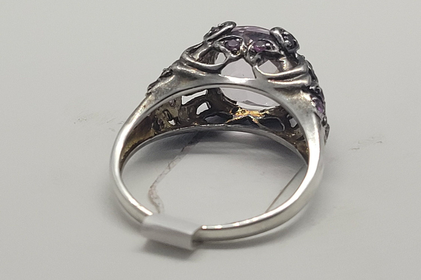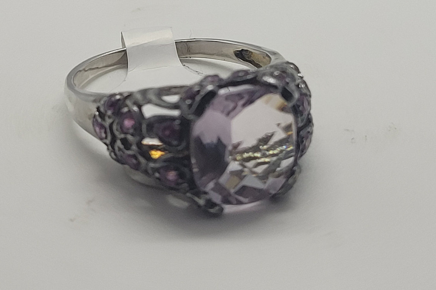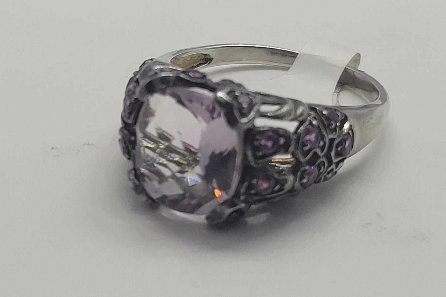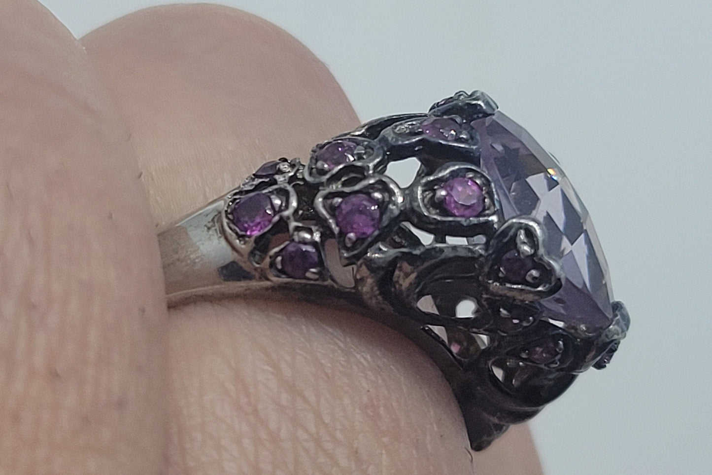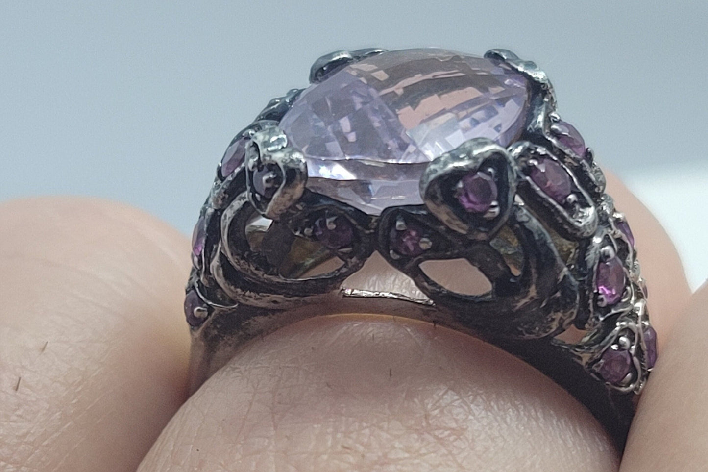 This is a vintage rose quartz with pink tourmaline sidestones set in 925 sterling silver setting with heart design, with a distinguished faceted rose quartz stone measuring around 10 mm x 11 mm.