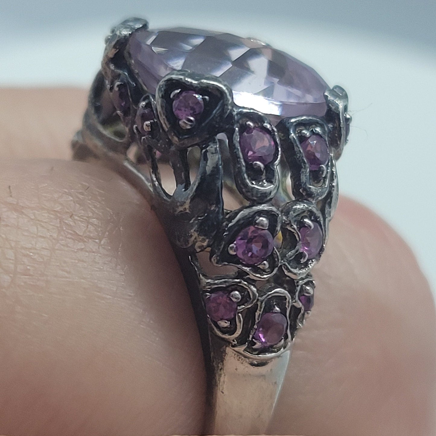 This stunning ring is a naturally larger size and consists of delicate silverwork and gorgeous gemstones in an elegant statement ring.