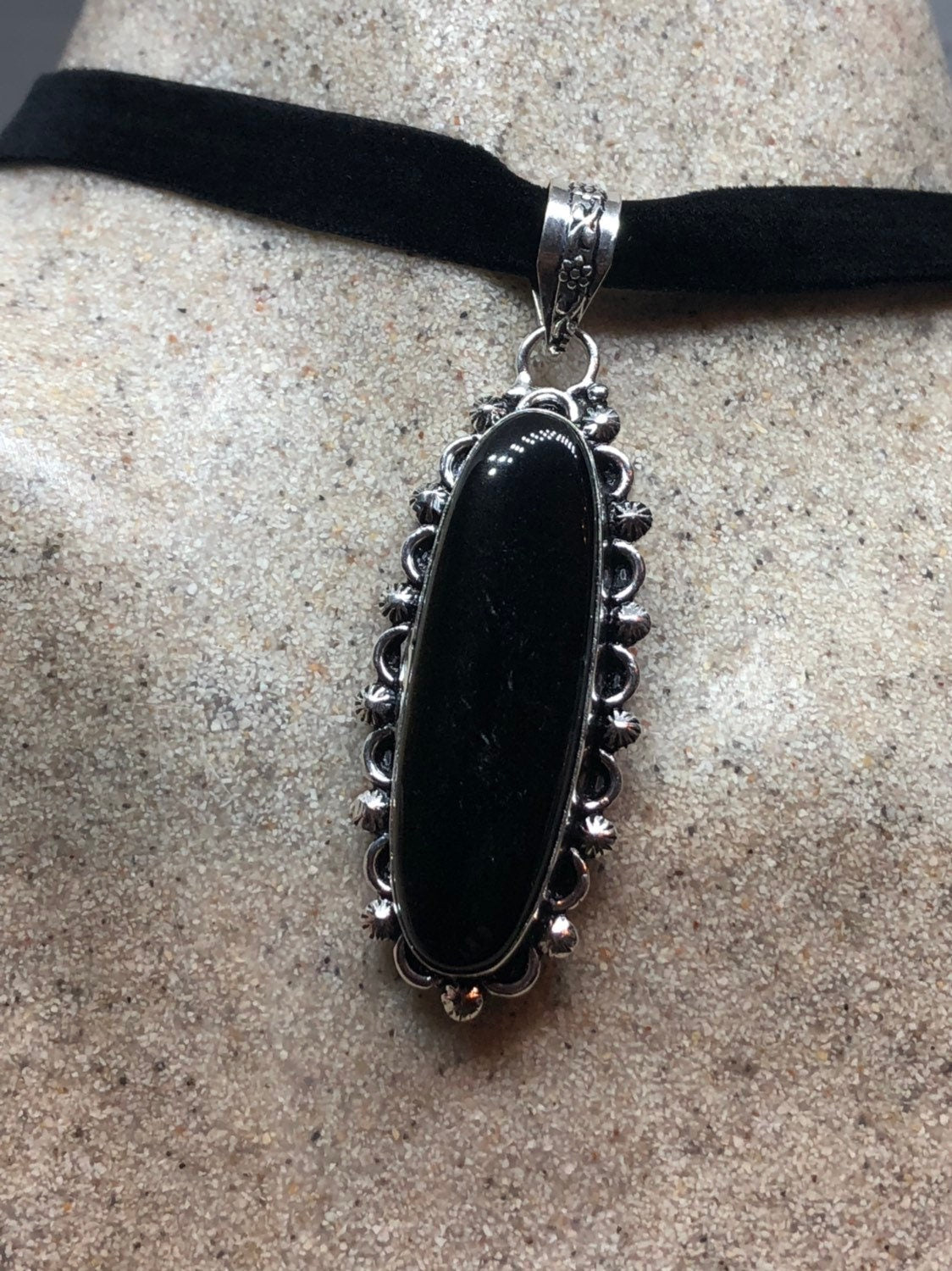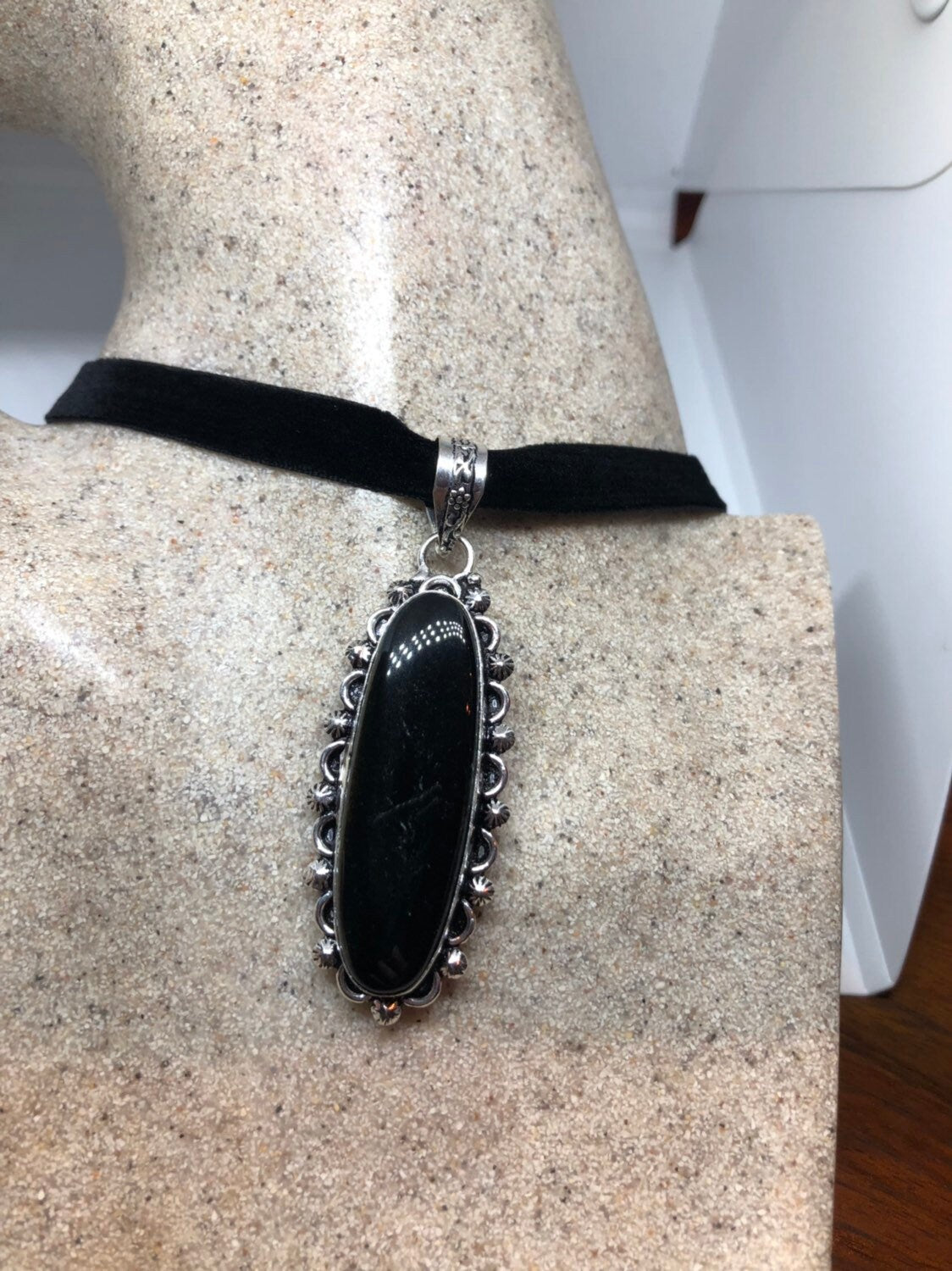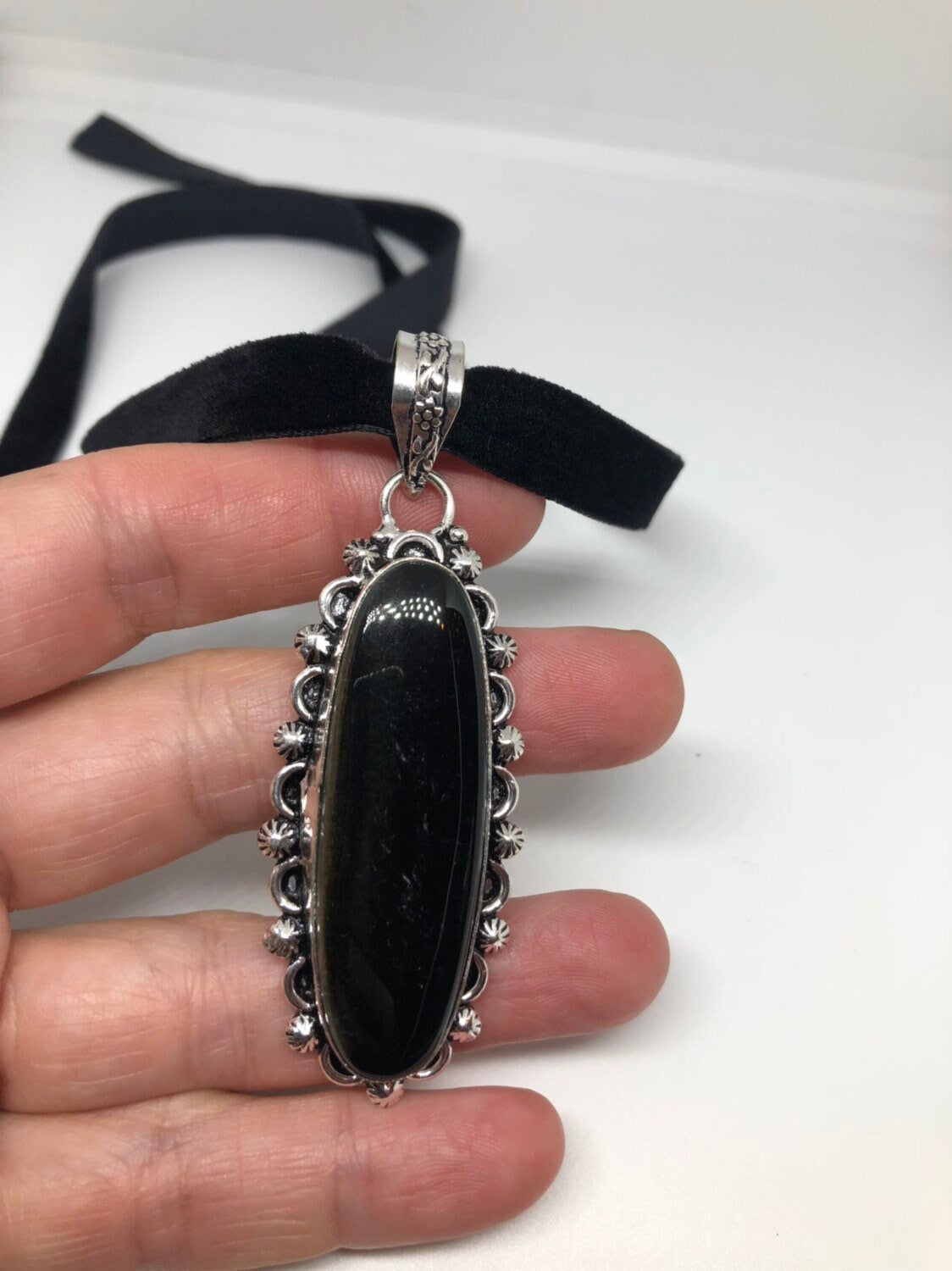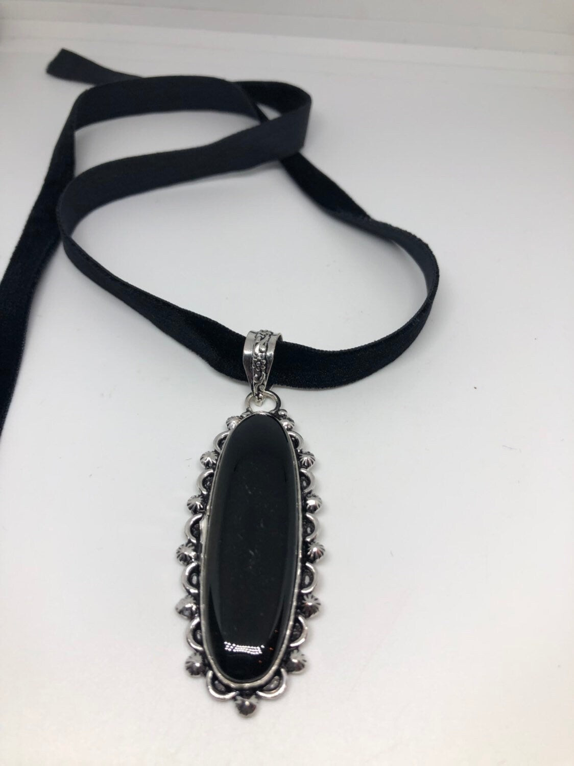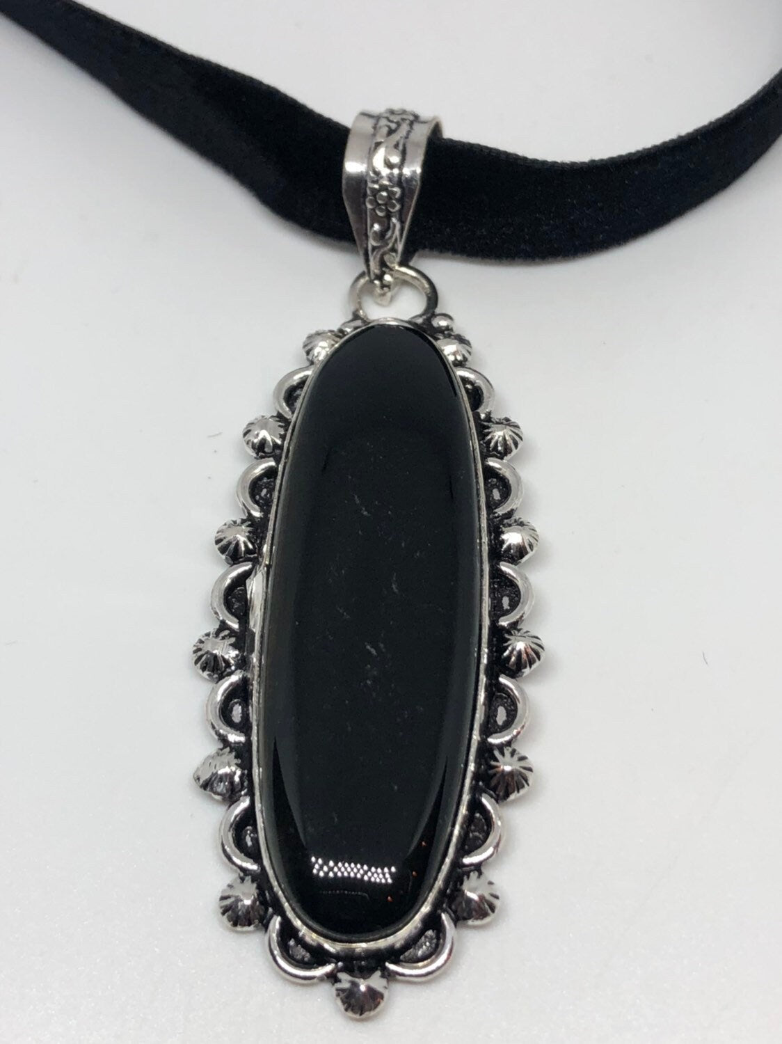 Vintage Silver Genuine Black Onyx Dangle Pendant Necklace