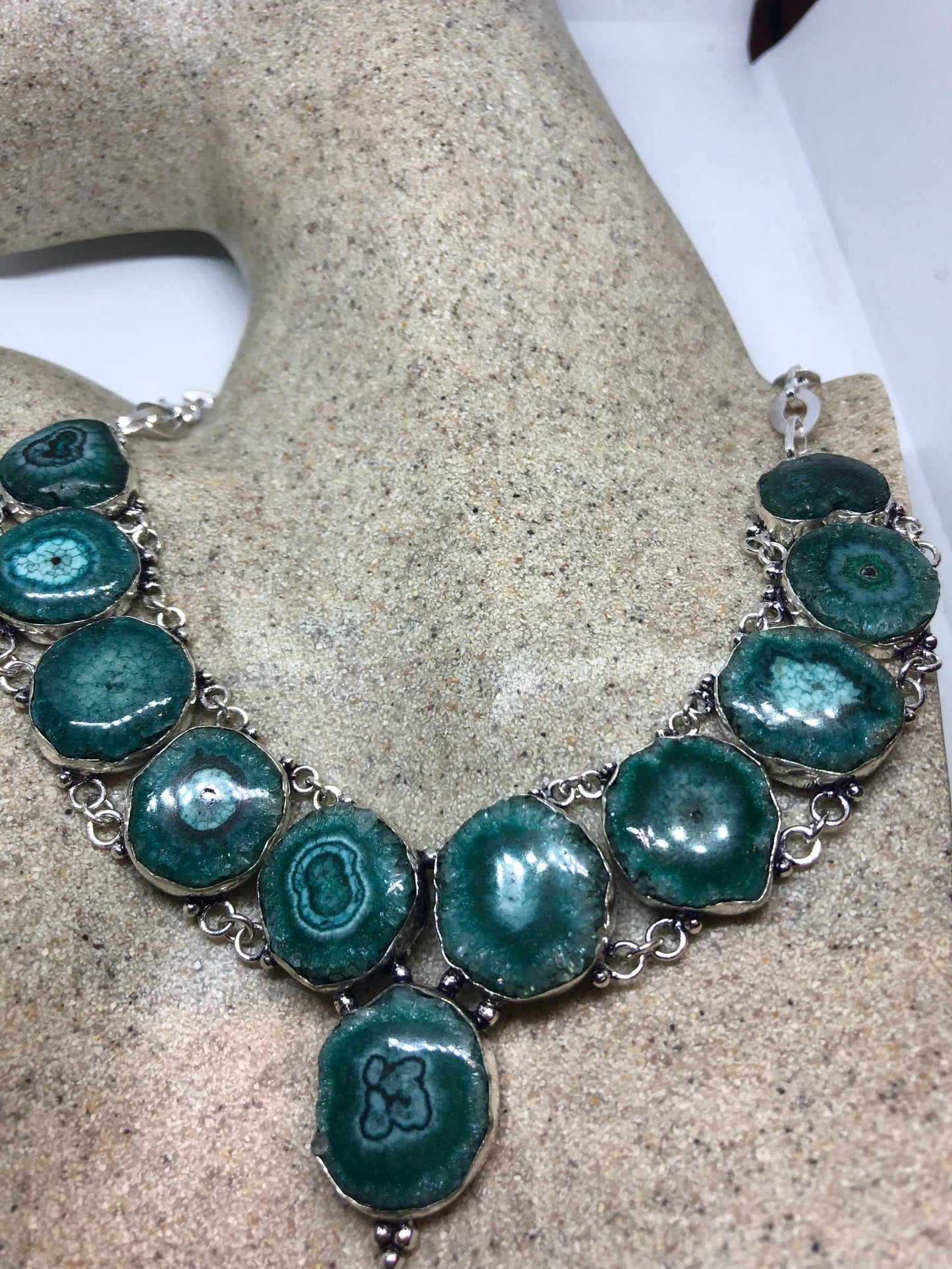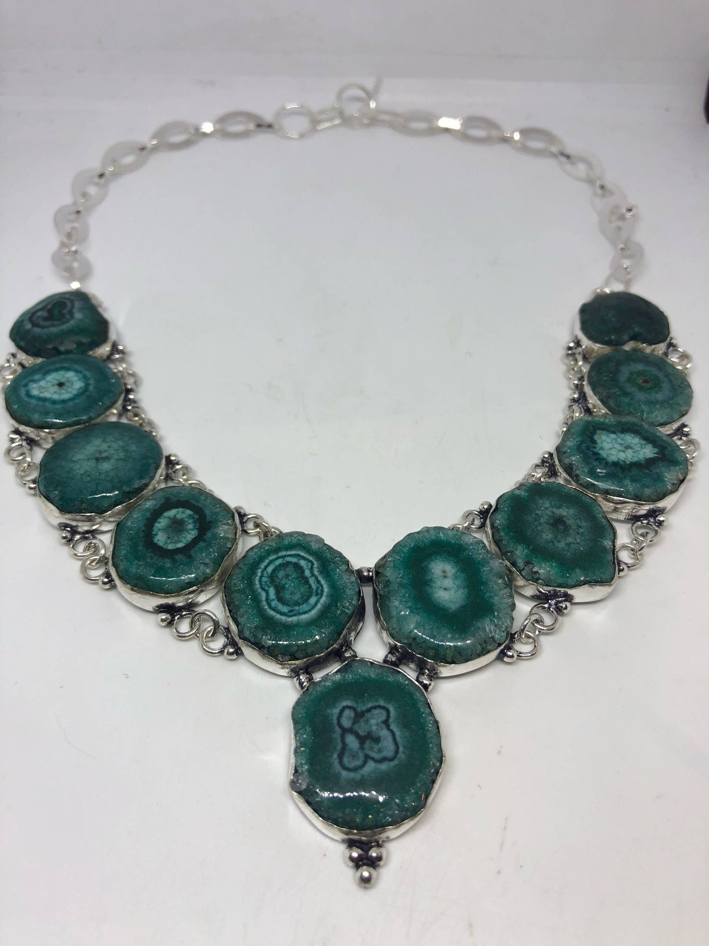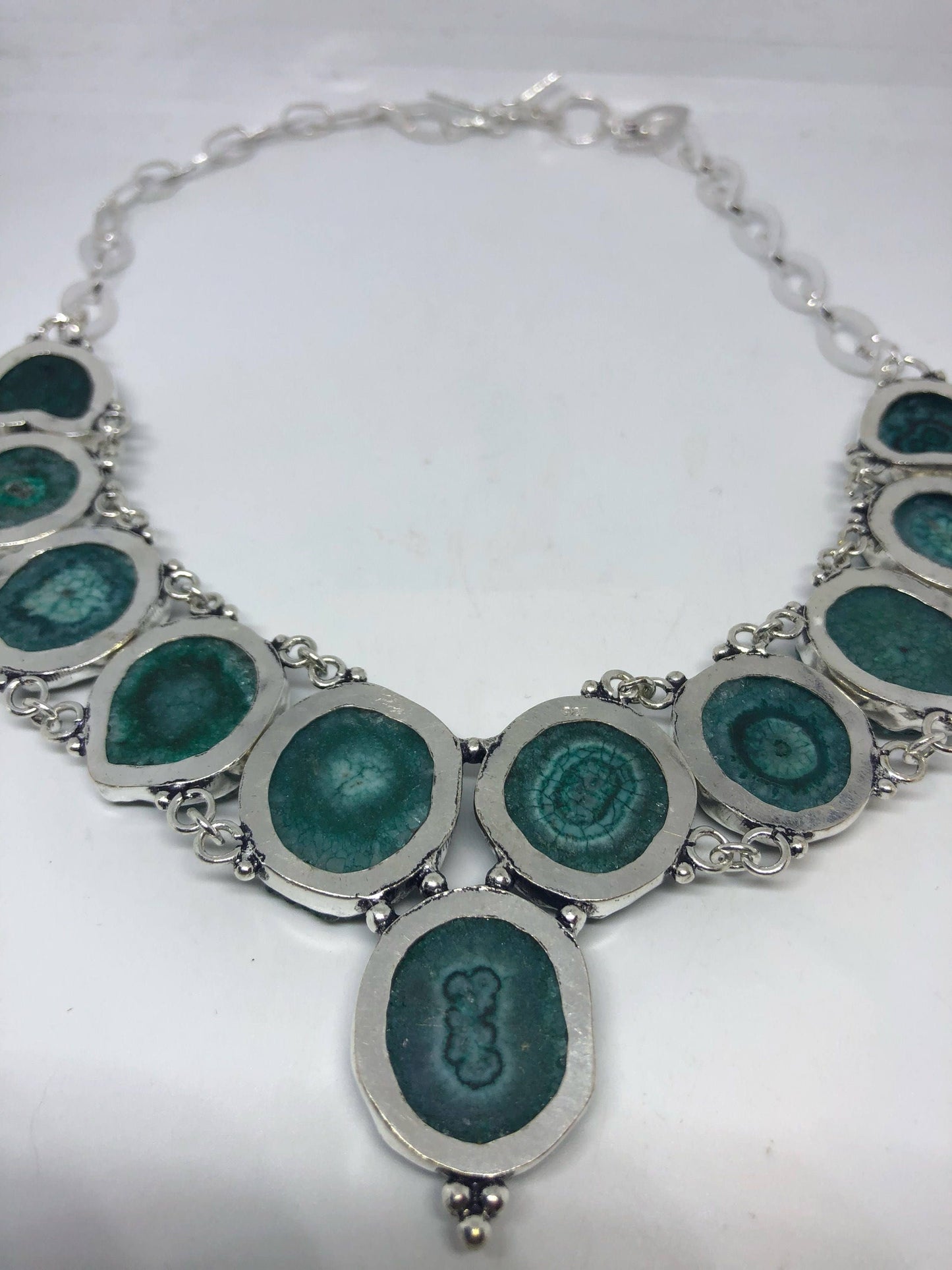 Vintage Silver Genuine Green Agate Gemstone Geode Necklace.