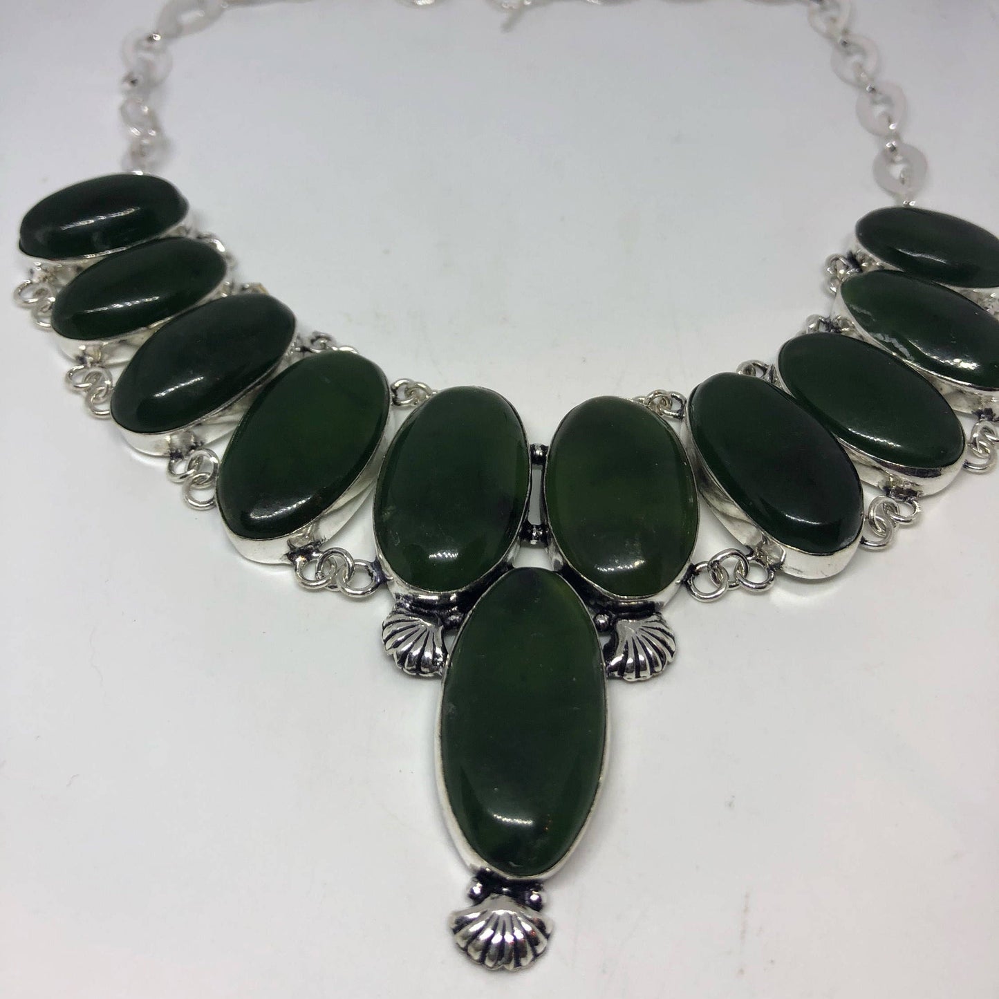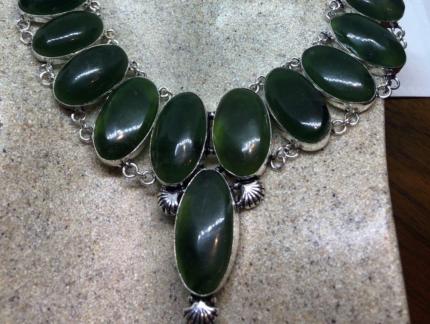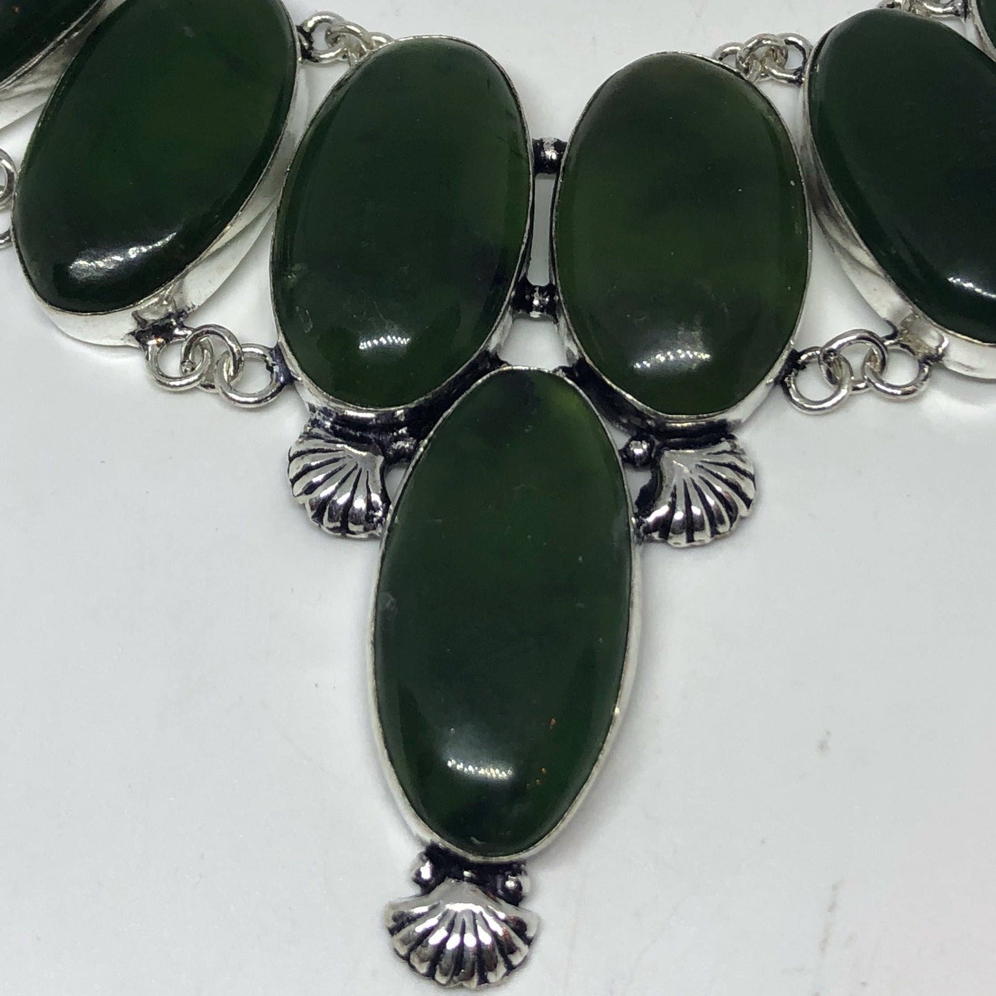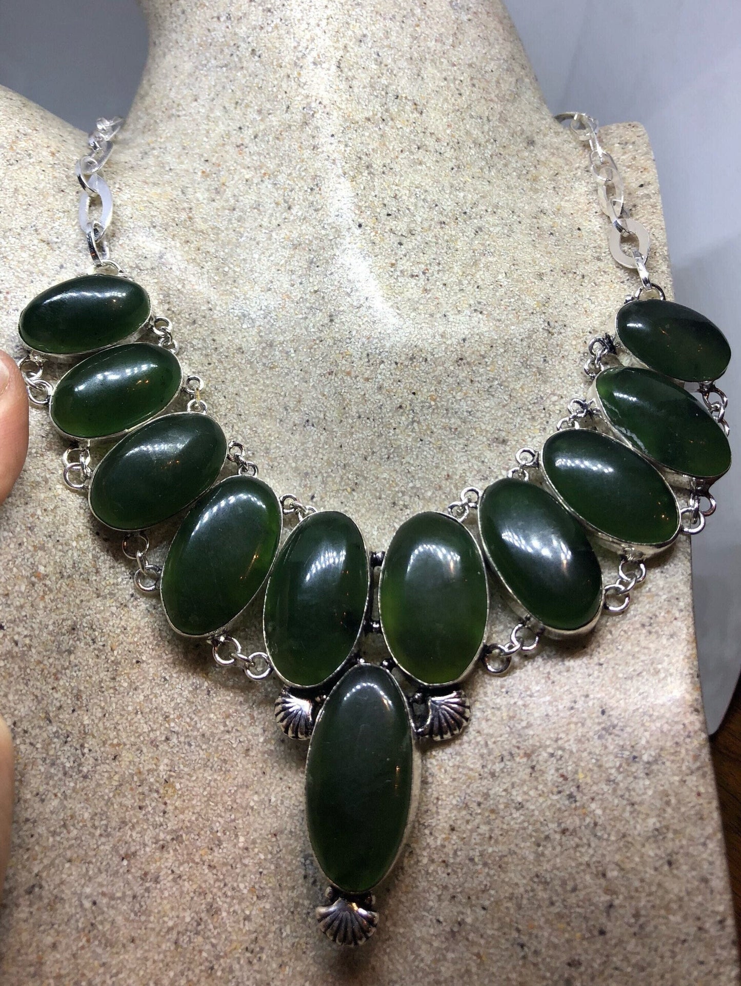 Vintage Silver Genuine Green Nephrite Jade Gemstone Necklace.