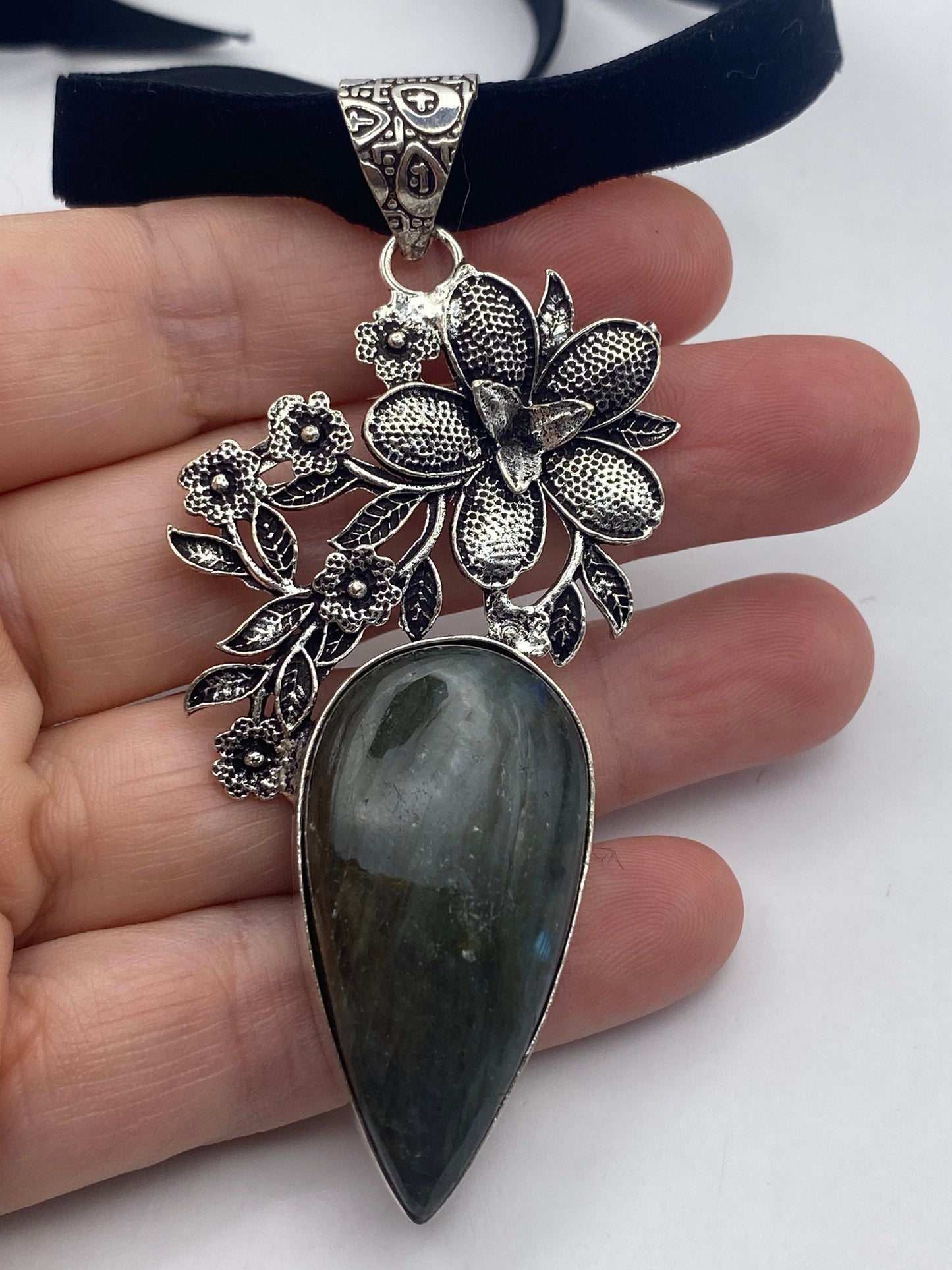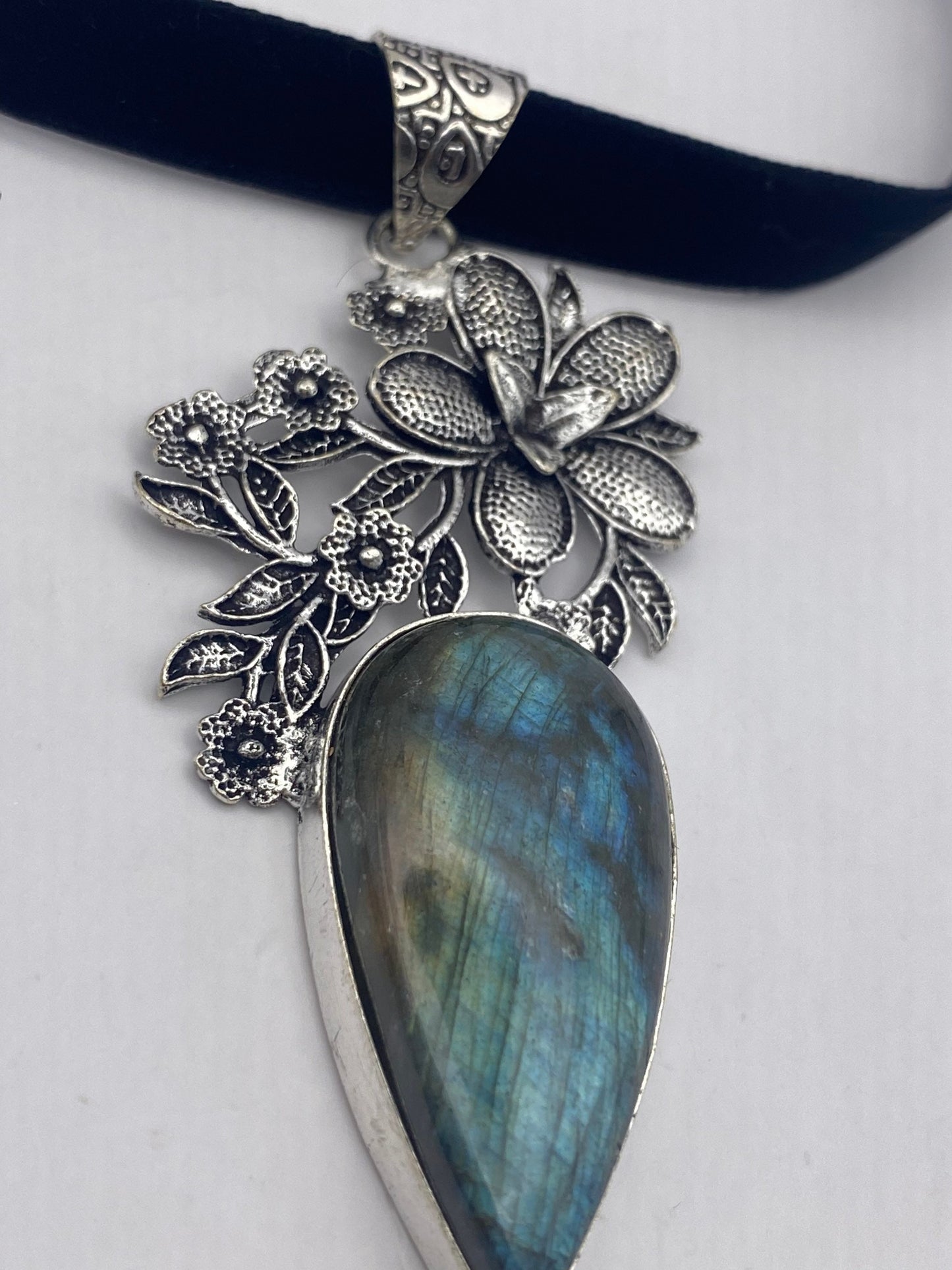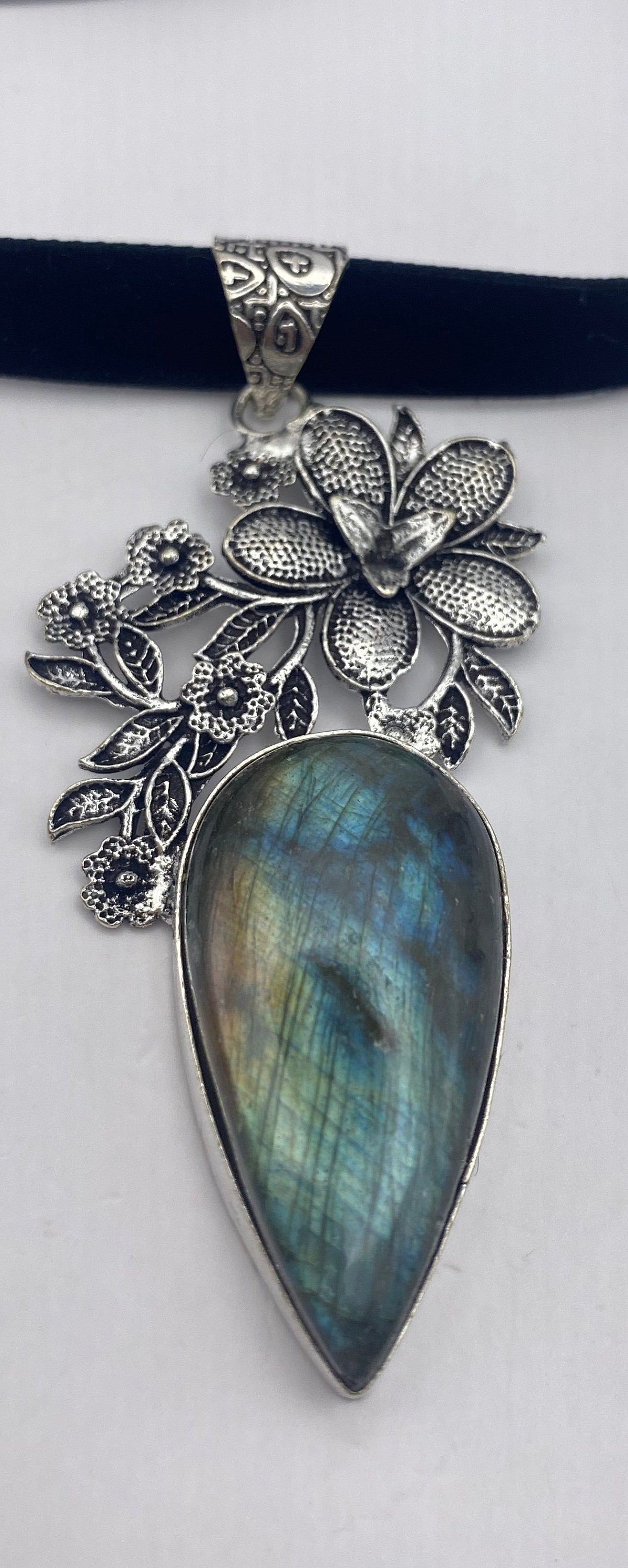 Vintage Silver Genuine Rainbow Labradorite Choker Black Velvet Necklace.