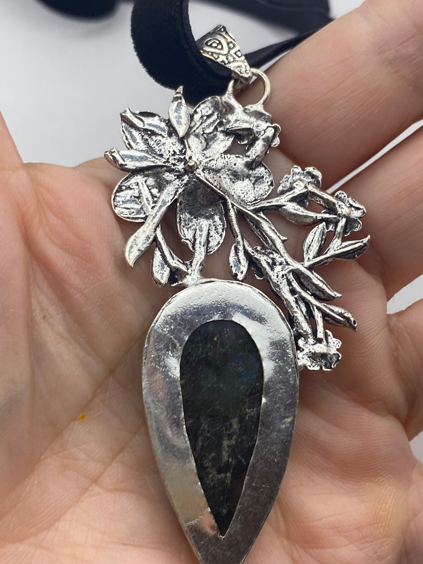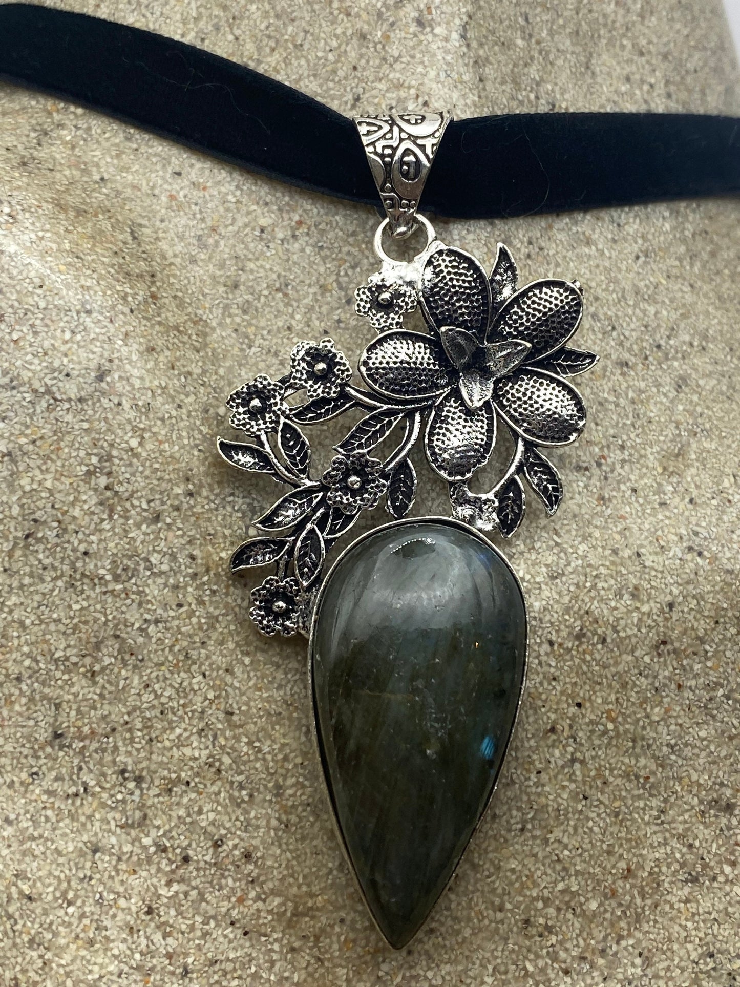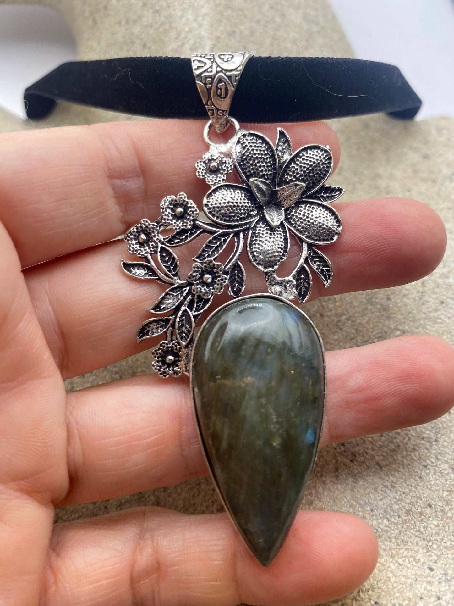 Vintage Silver Genuine Rainbow Labradorite Choker Black Velvet Necklace.