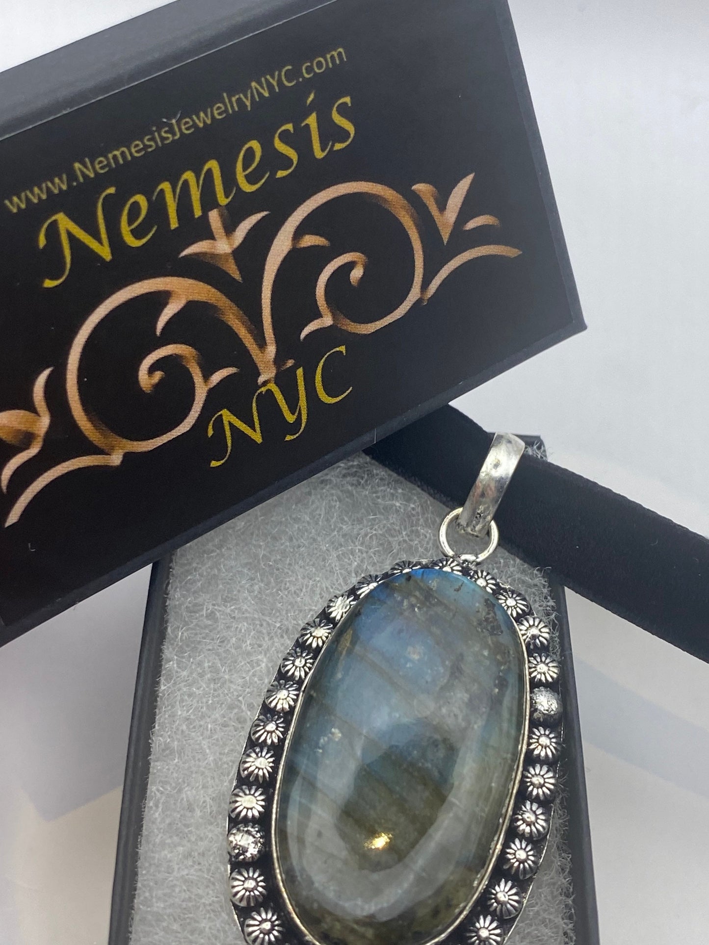 Ships on a velvet ribbon. Can be worn on a chain.