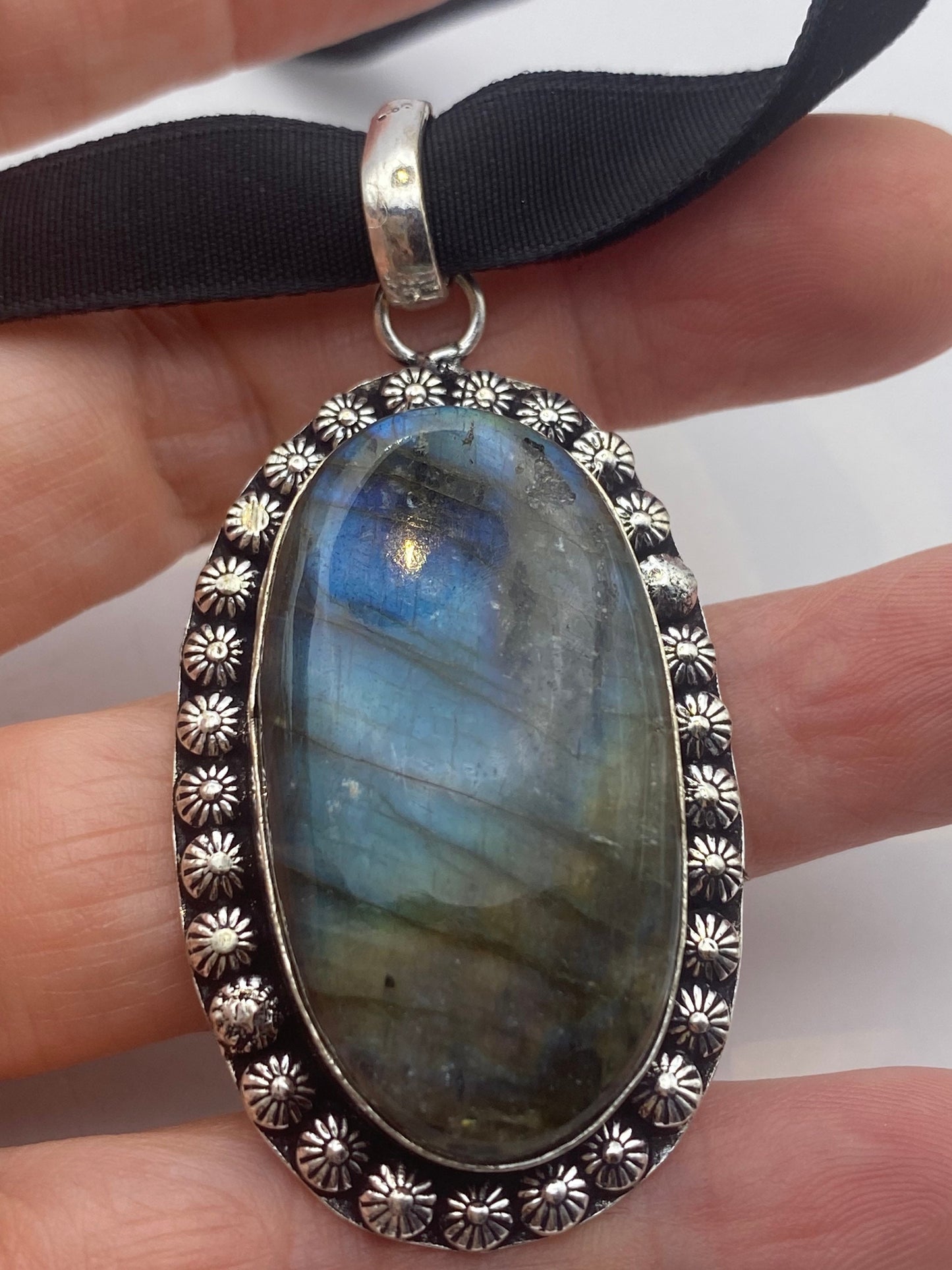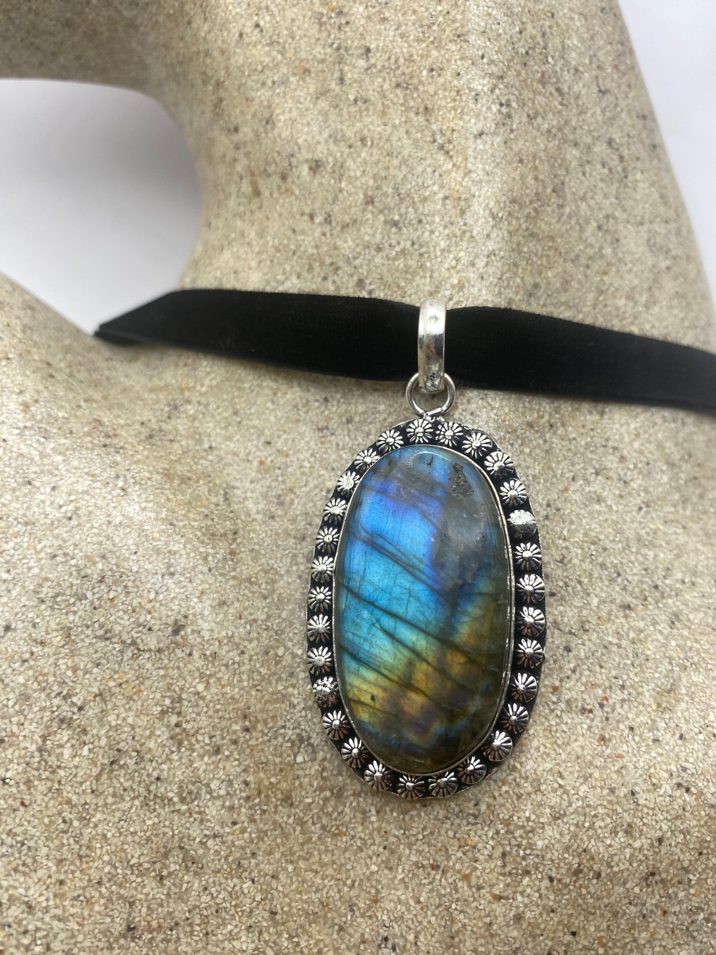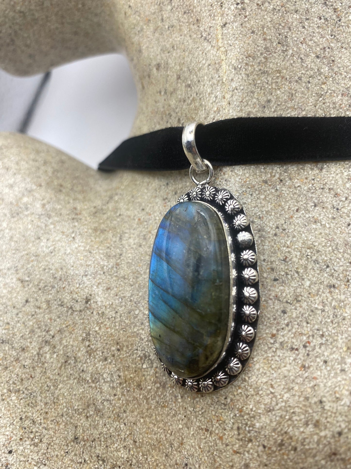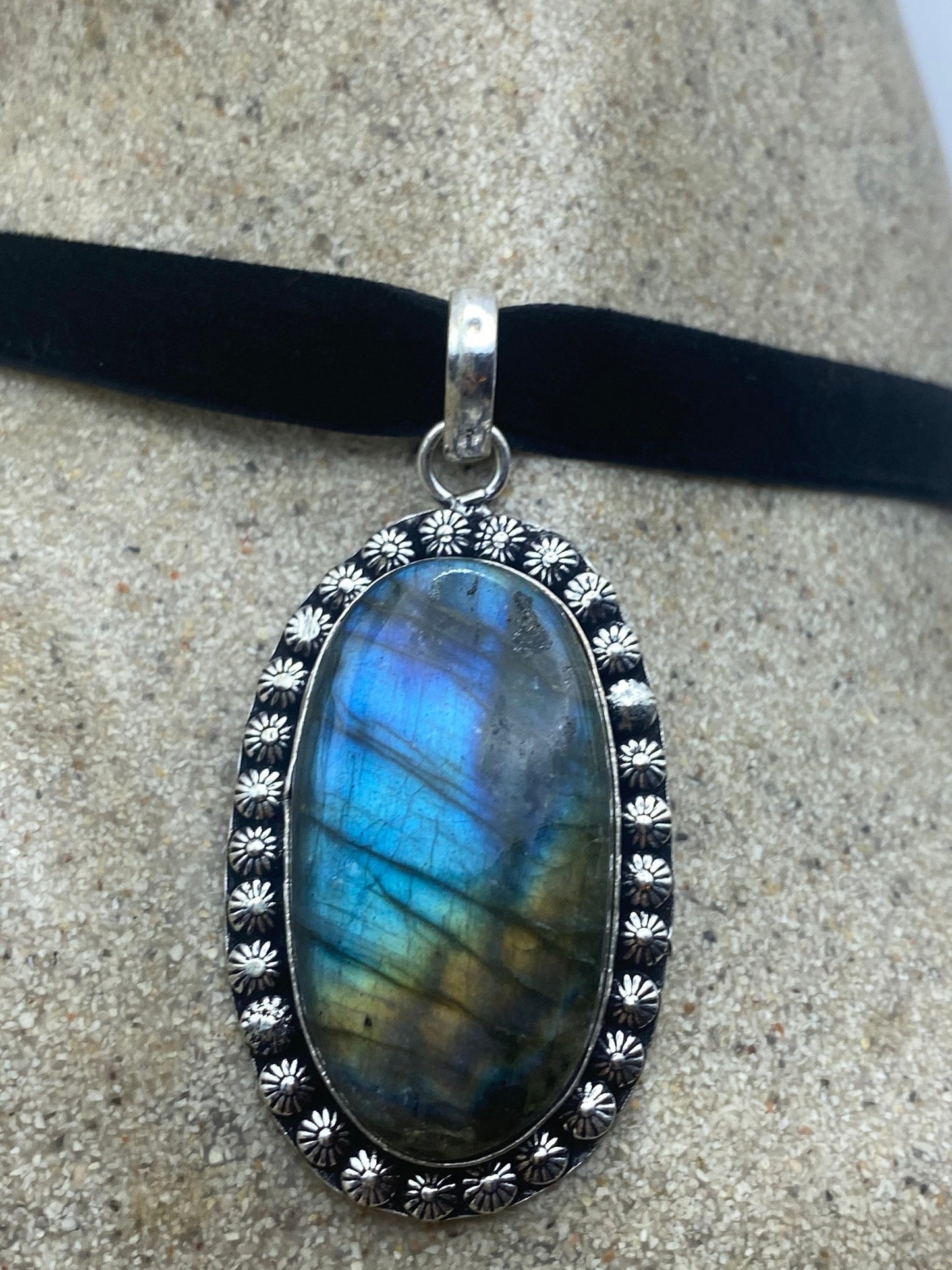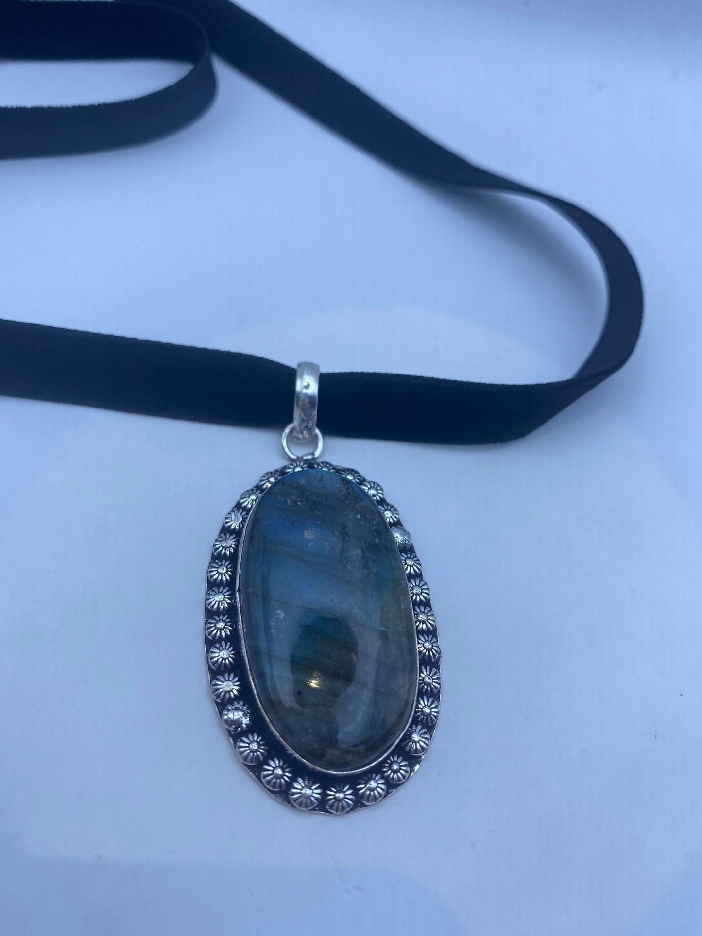Vintage Silver Genuine Rainbow Labradorite Choker Black Velvet Necklace.