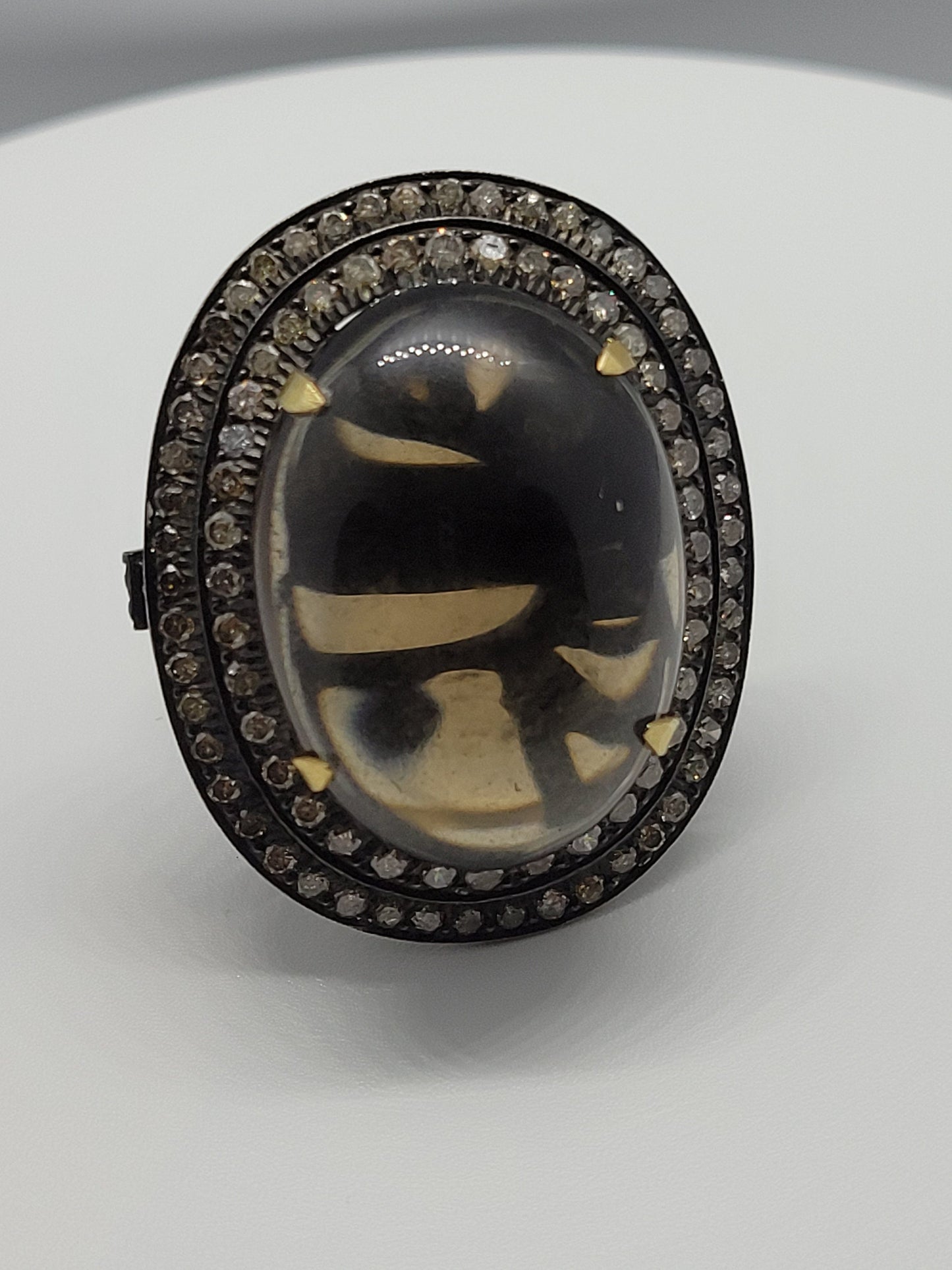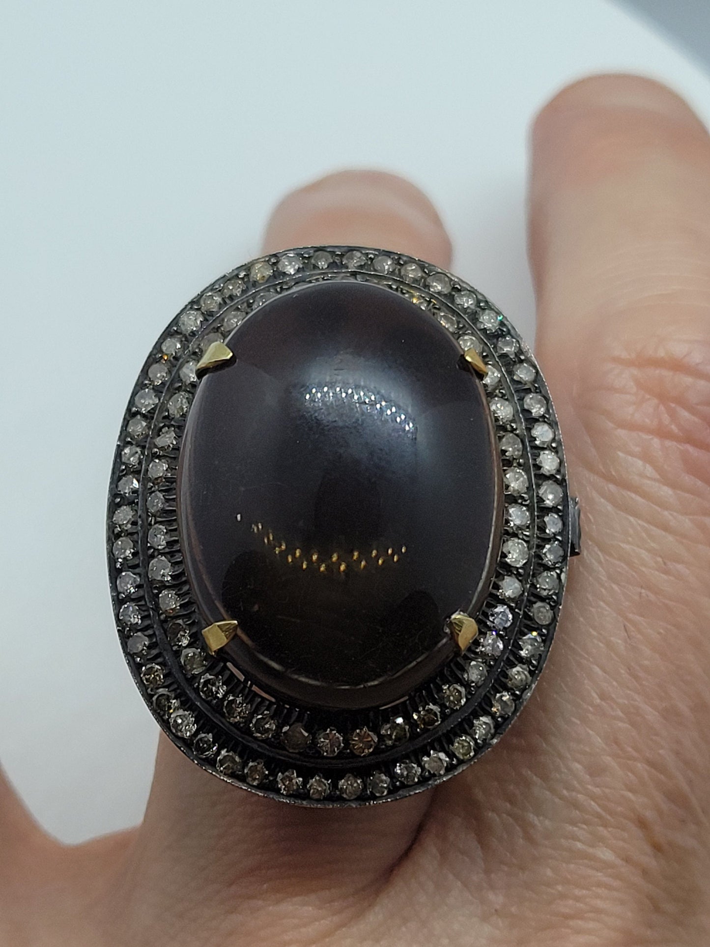 This ring is 18.5 grams total, consisting of 925 sterling silver, sandwiched in 18k gold around a brilliant 38.5 carat smoky topaz and set with 1.75 carats of diamonds.