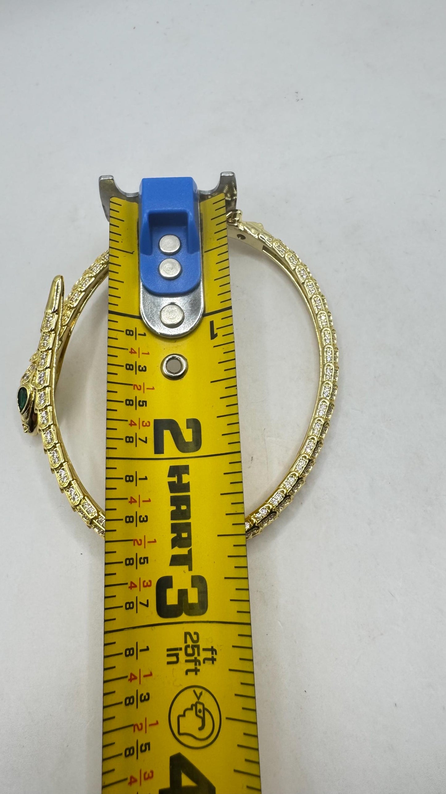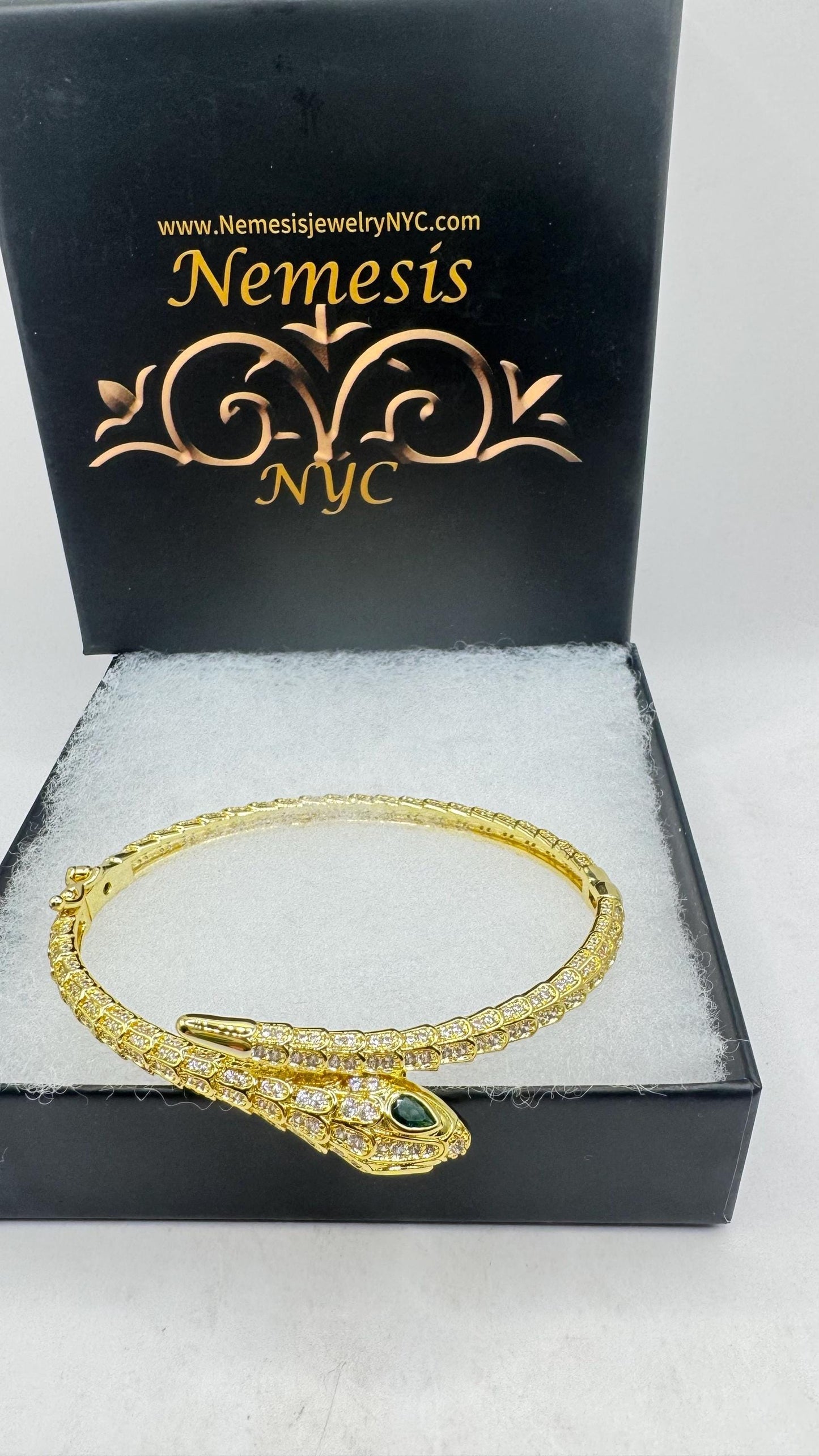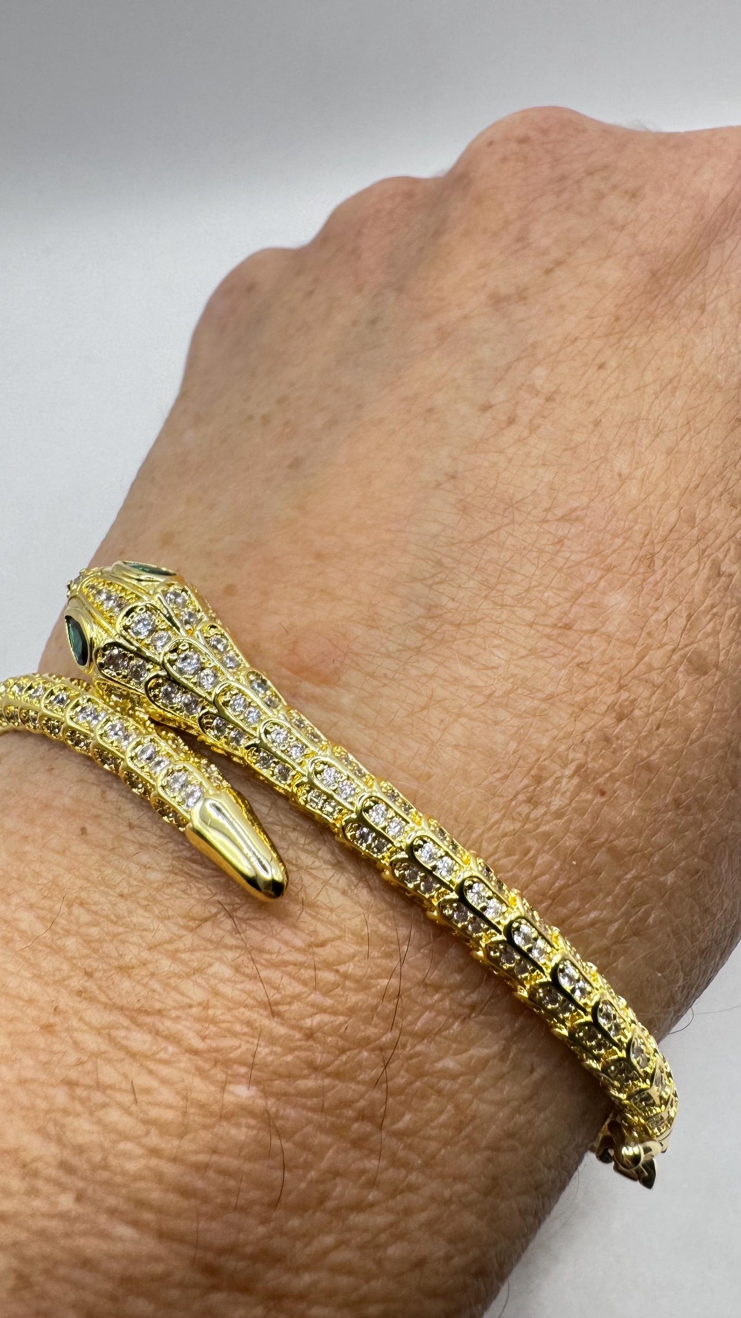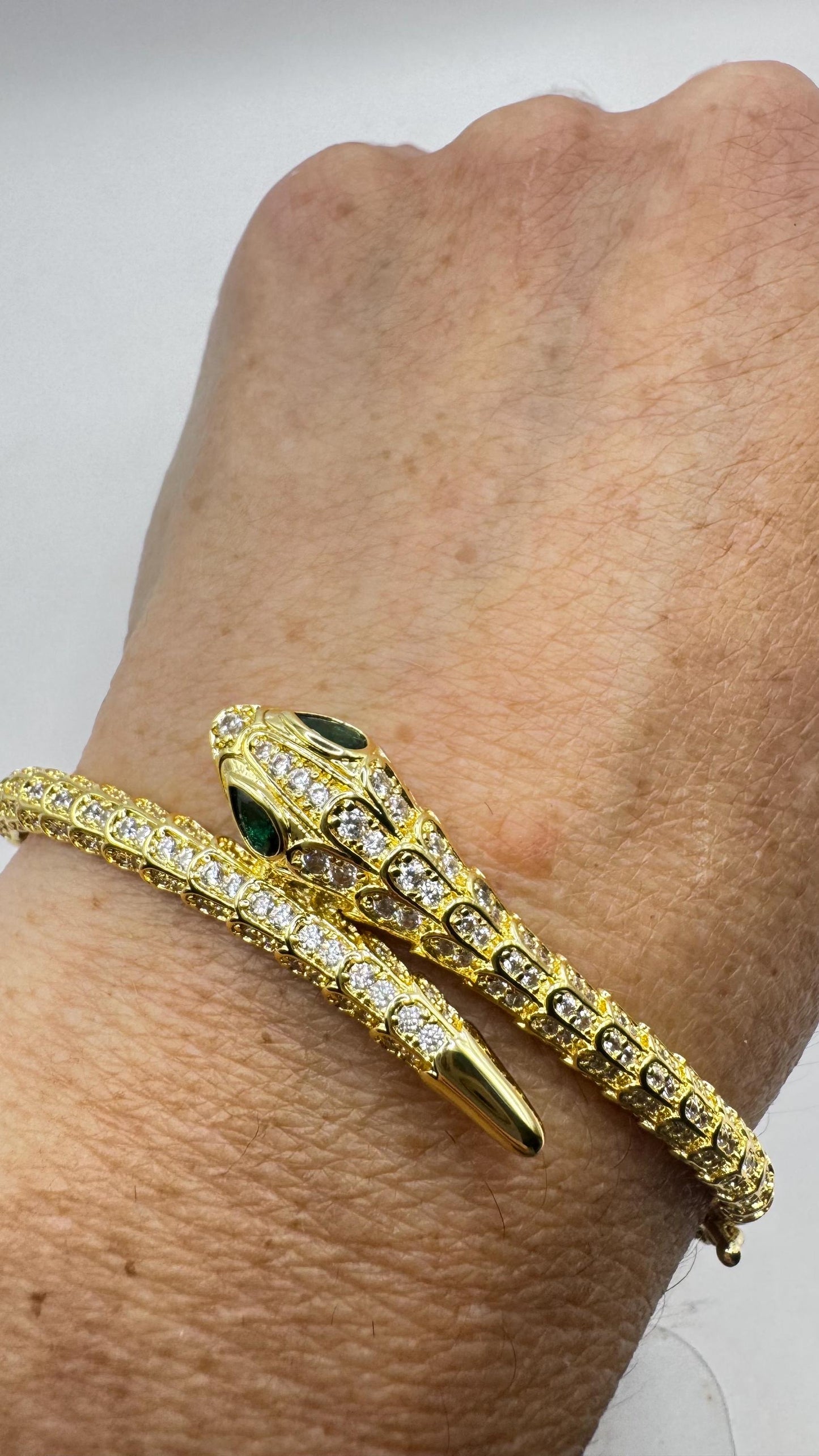 Vintage Snake Bangle Bracelet Gold finished Bronze Green Crystal Eyes