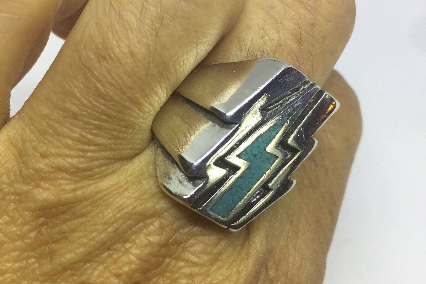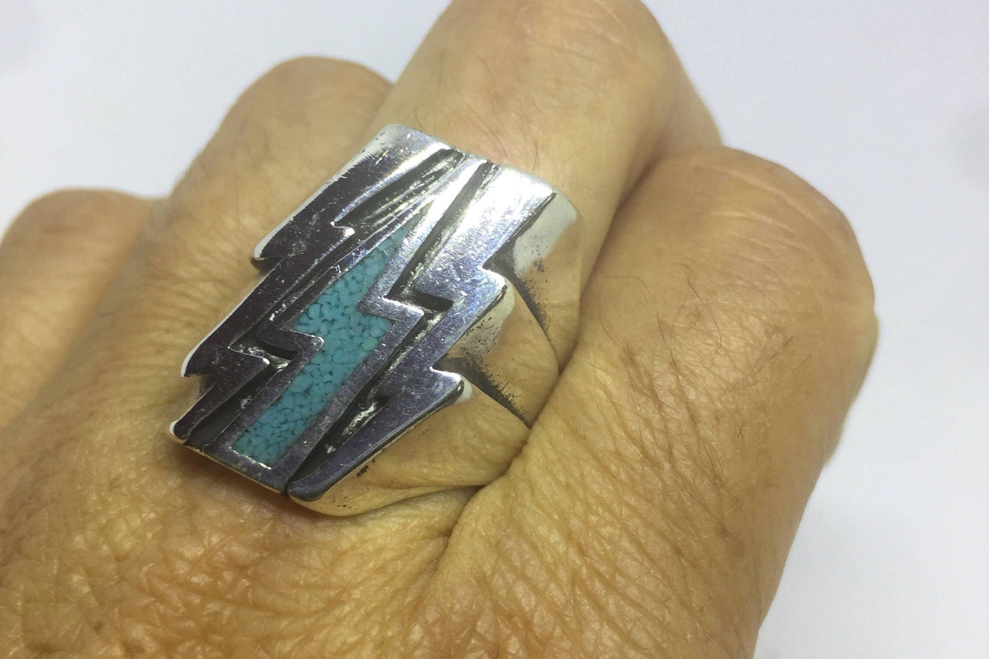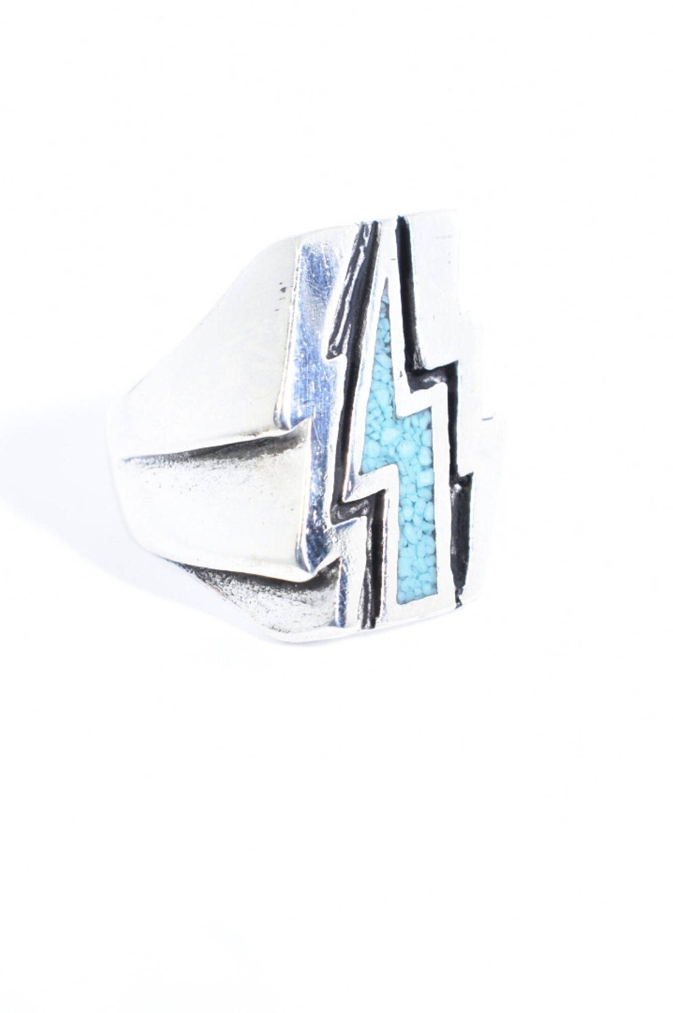 Vintage Southwestern Turquoise Inlay Lighting Bolt Men's Ring
