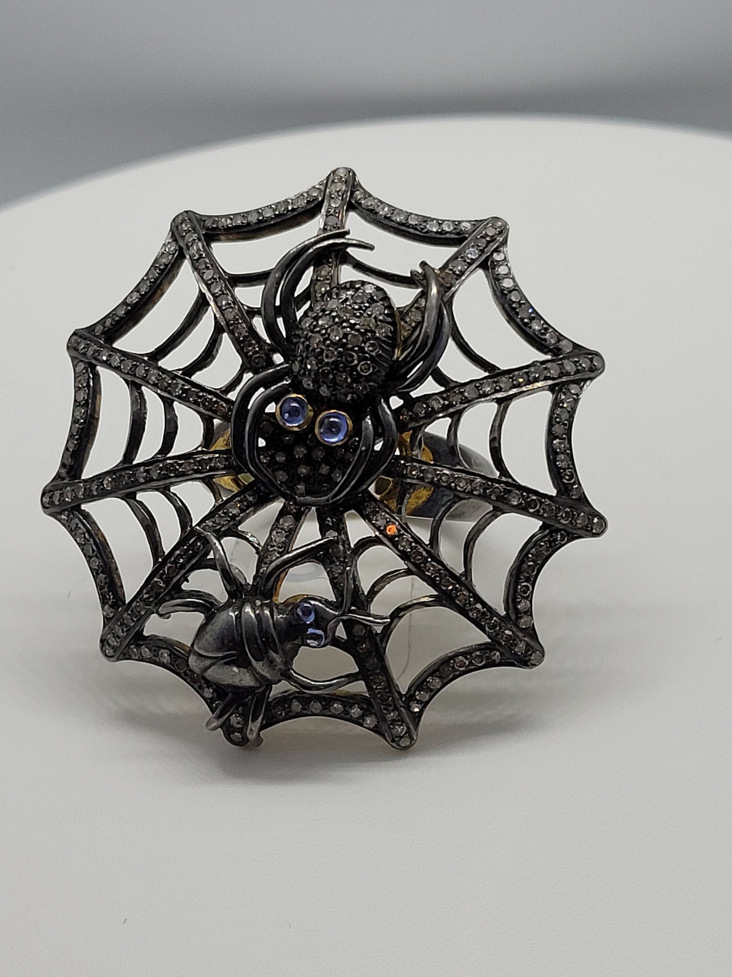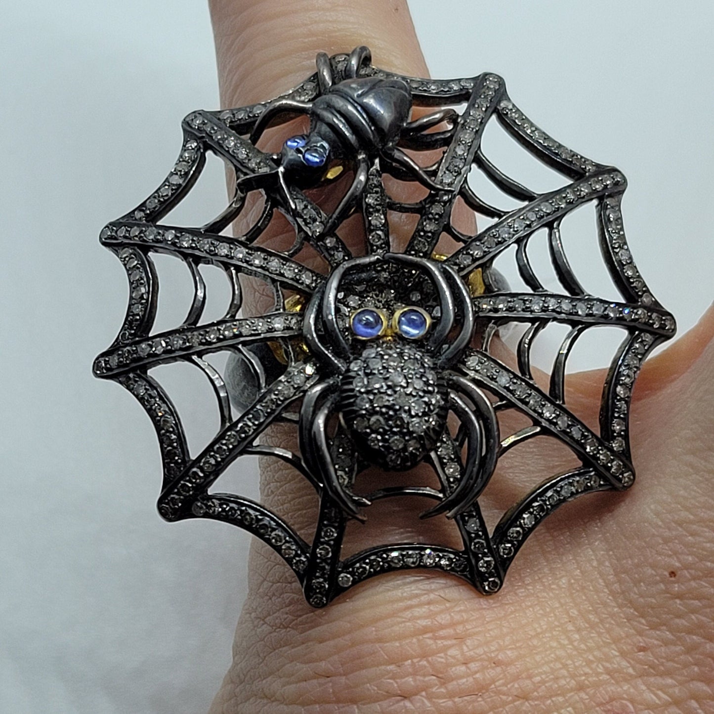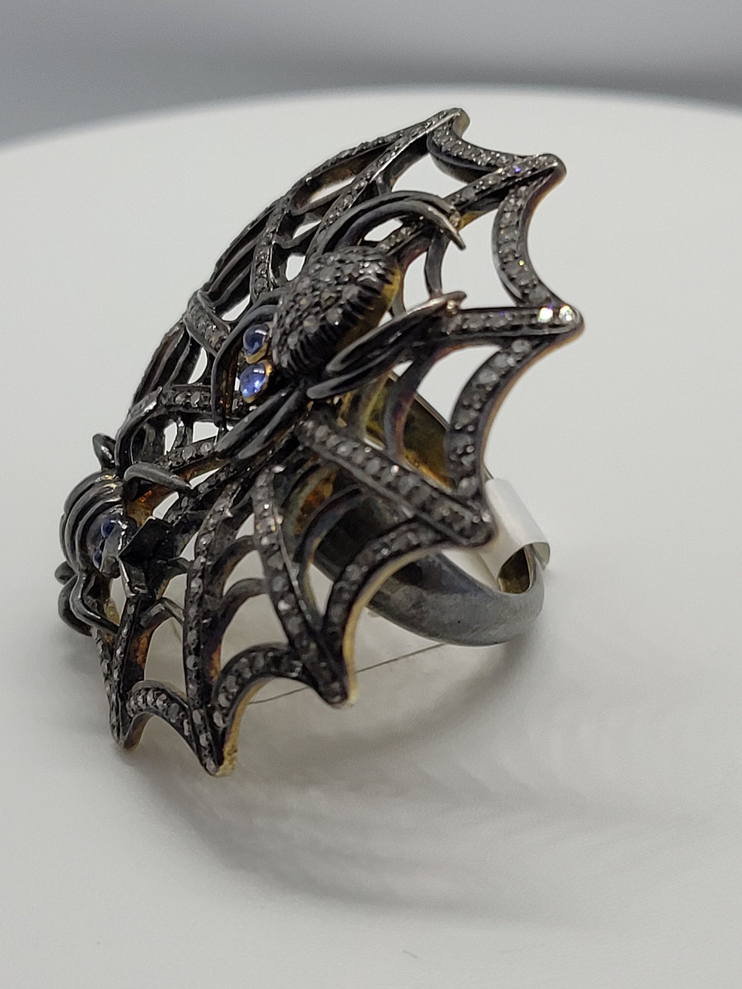 Vintage Spider Ring Champagne Diamonds with Blue Iolite in Unique 925 Sterling Silver Spider Web