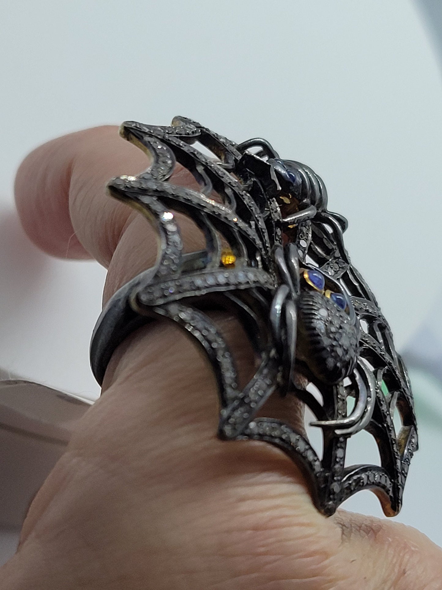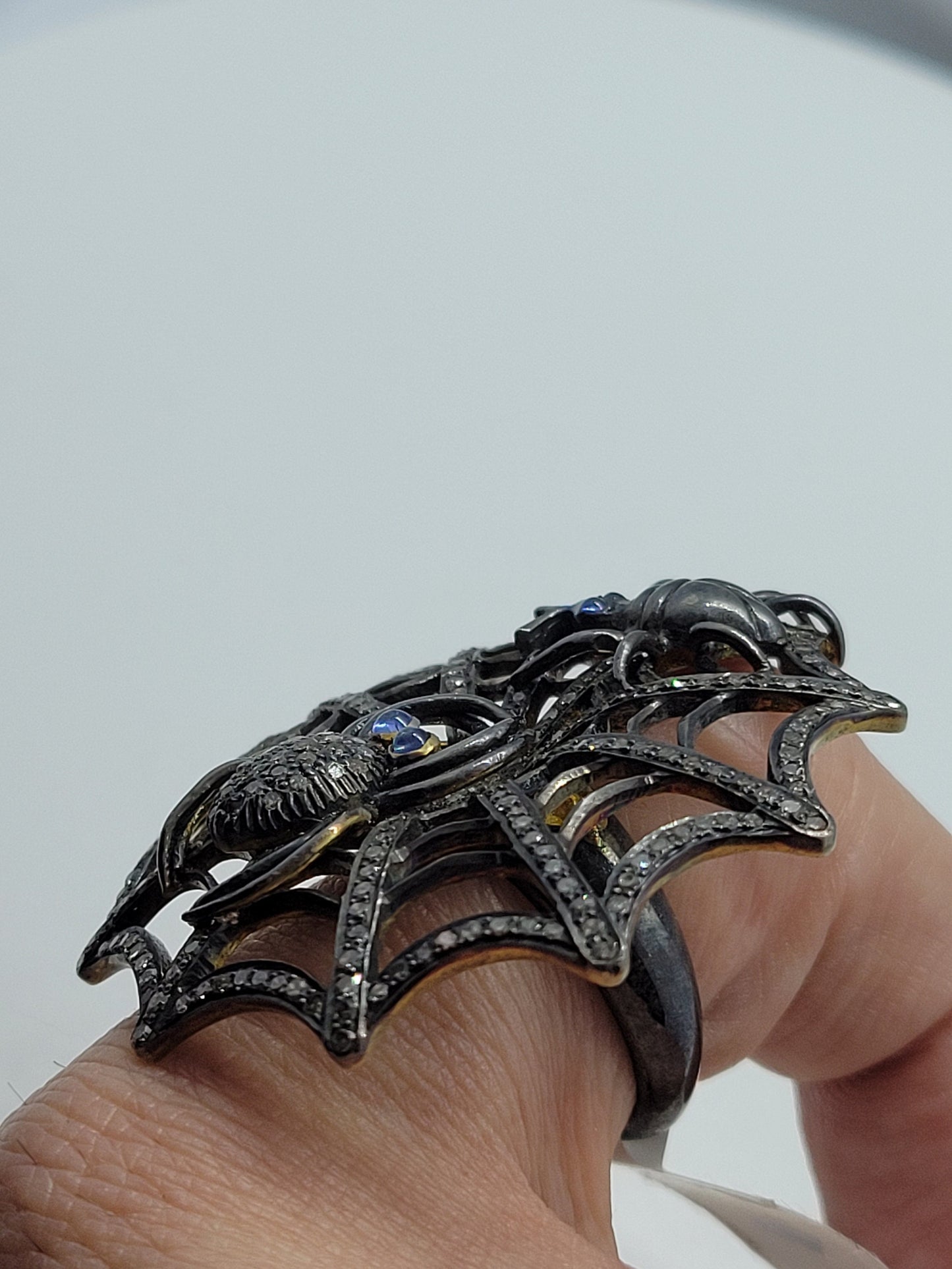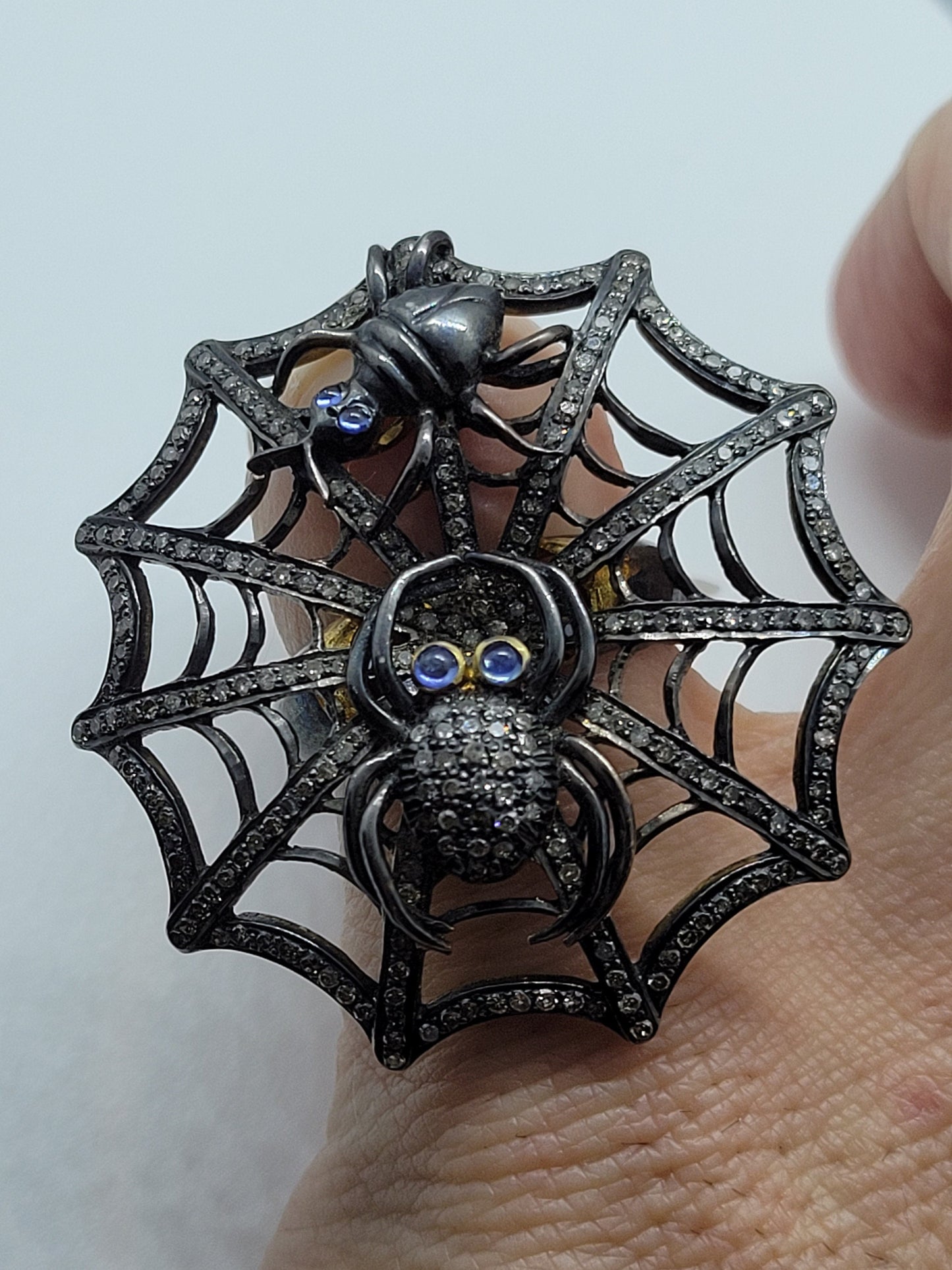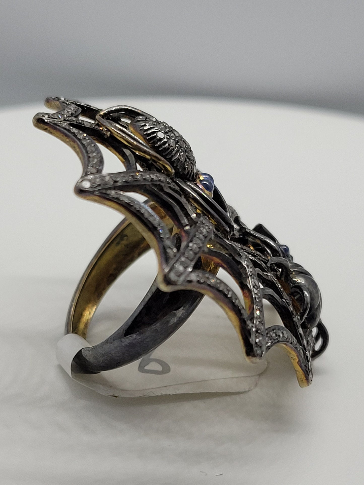 Vintage Spider Ring Champagne Diamonds with Blue Iolite in Unique 925 Sterling Silver Spider Web