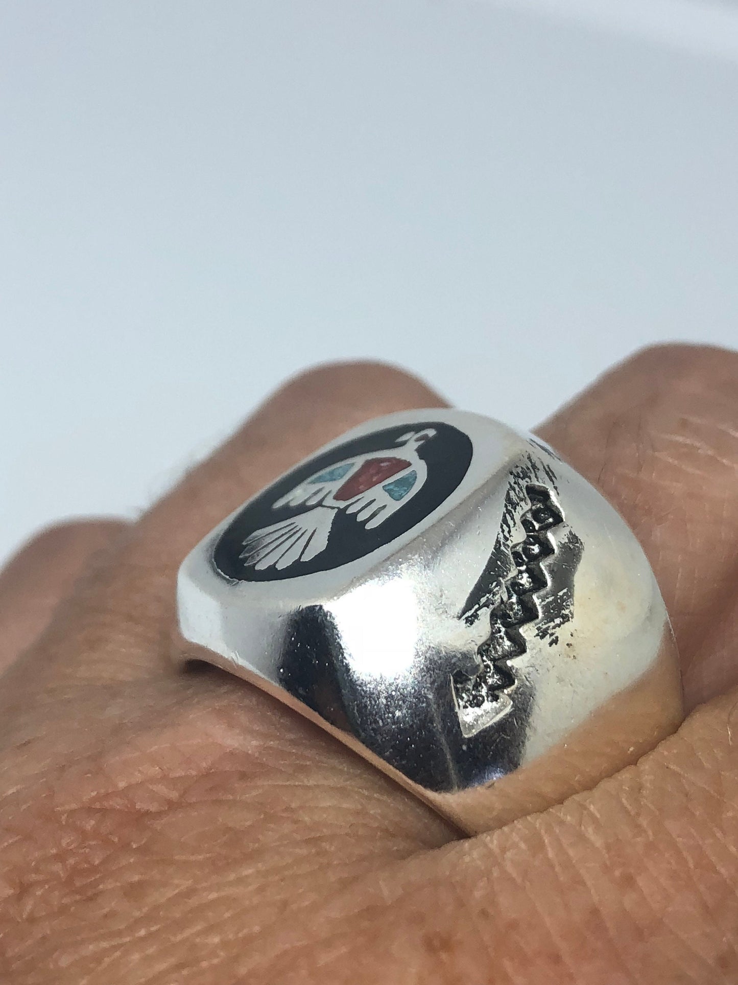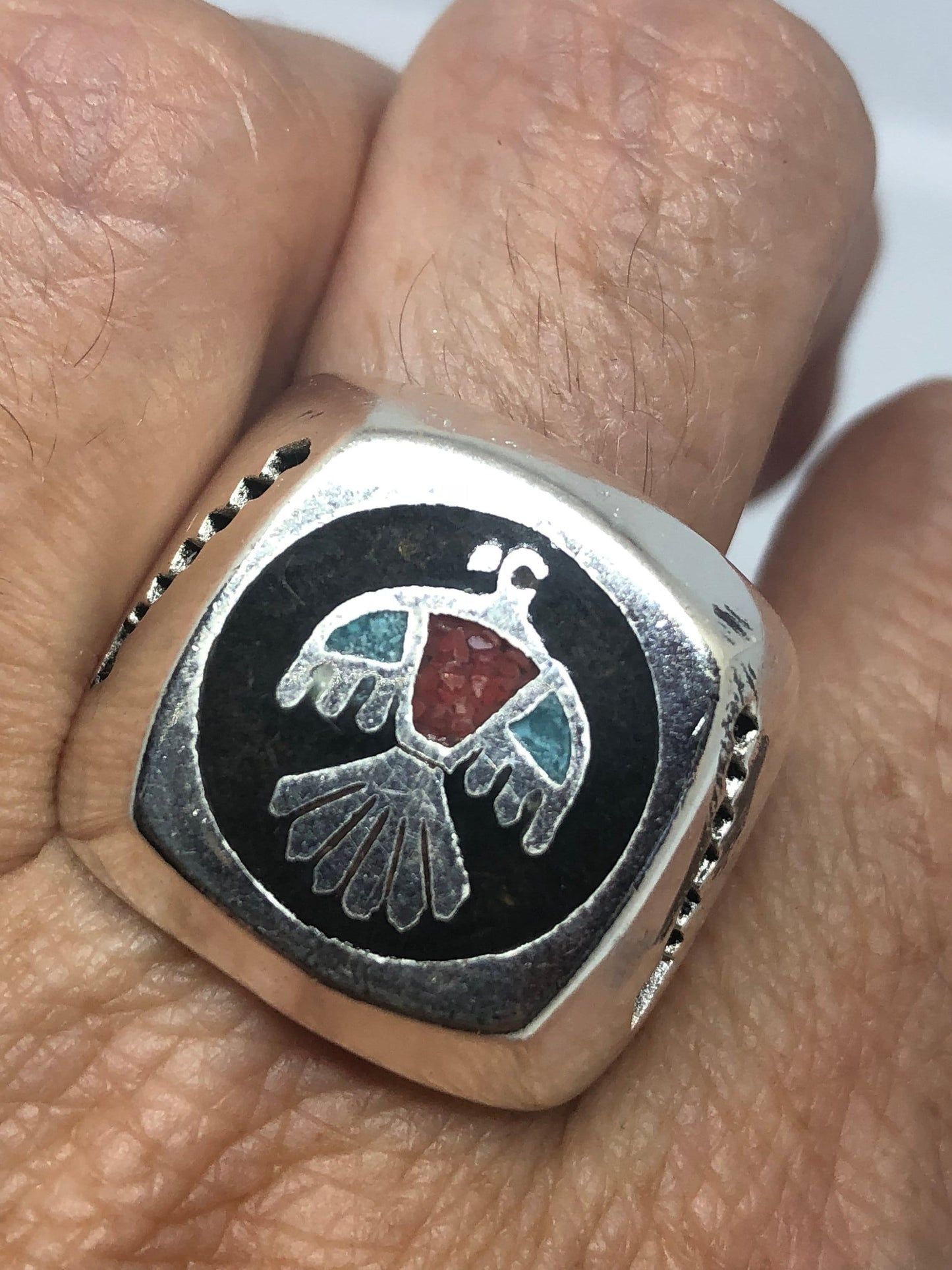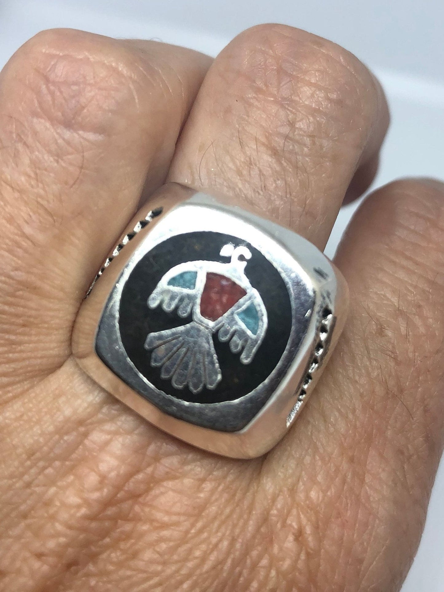 Vintage Thunderbird Ring Native American Style Southwestern Turquoise Stone Inlay Mens