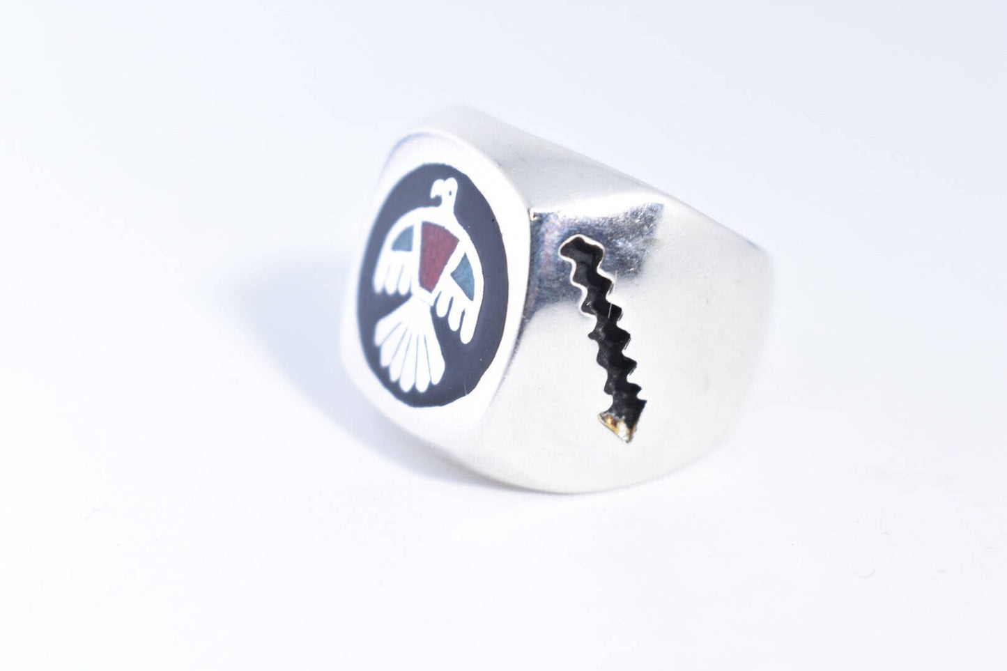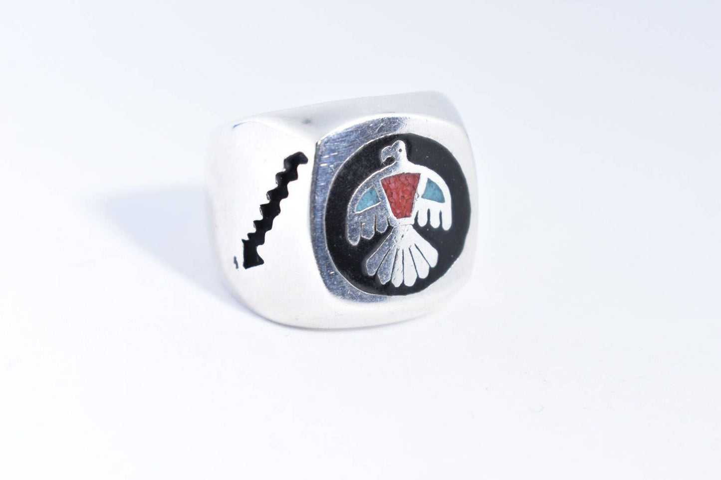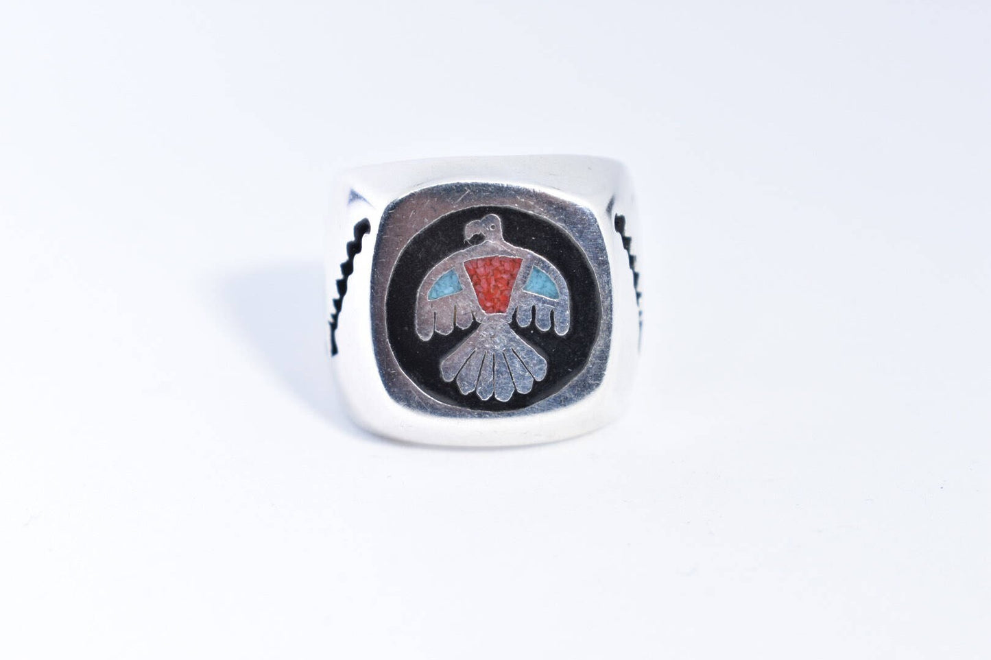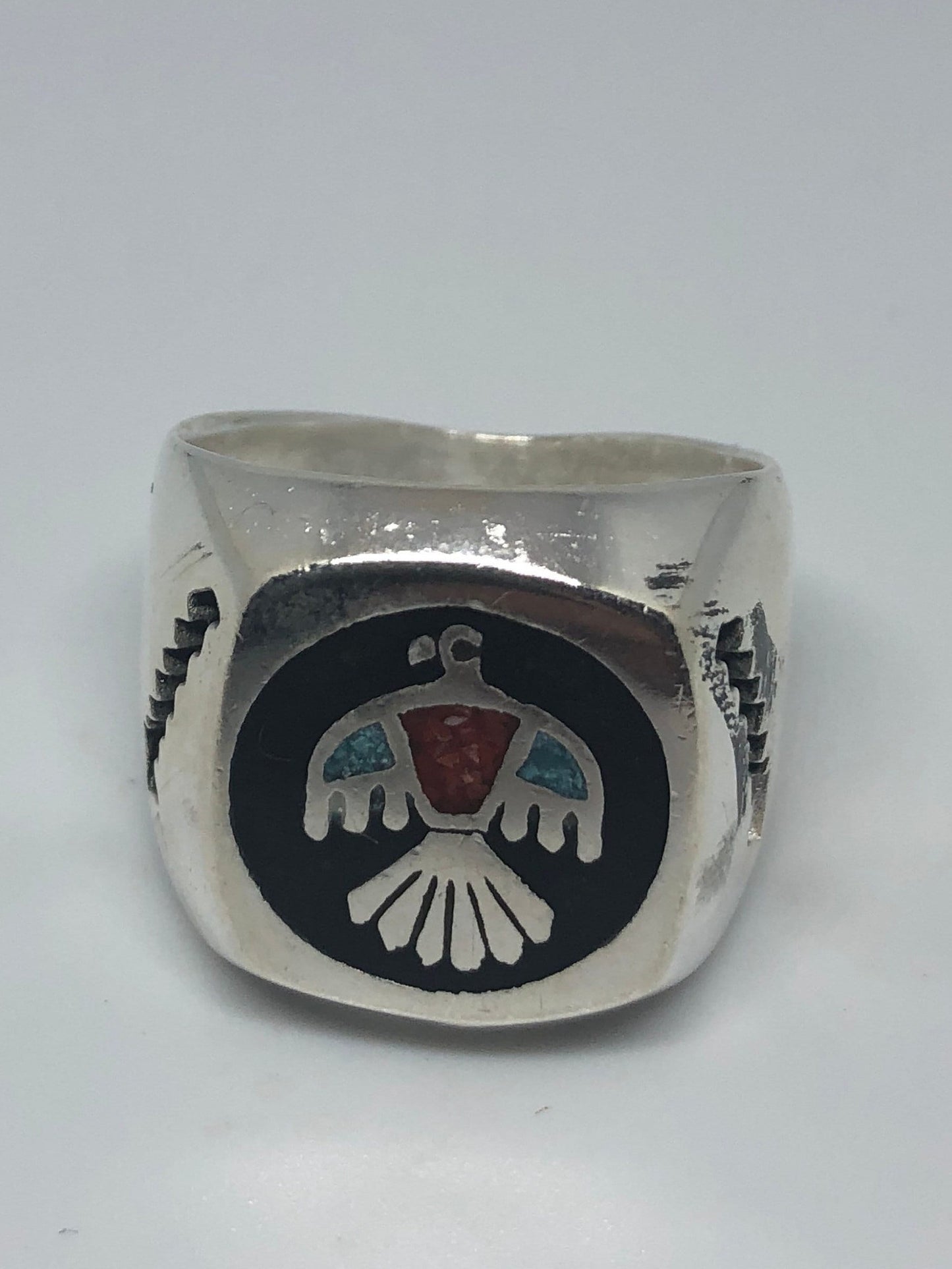 Vintage Thunderbird Ring Native American Style Southwestern Turquoise Stone Inlay Mens
