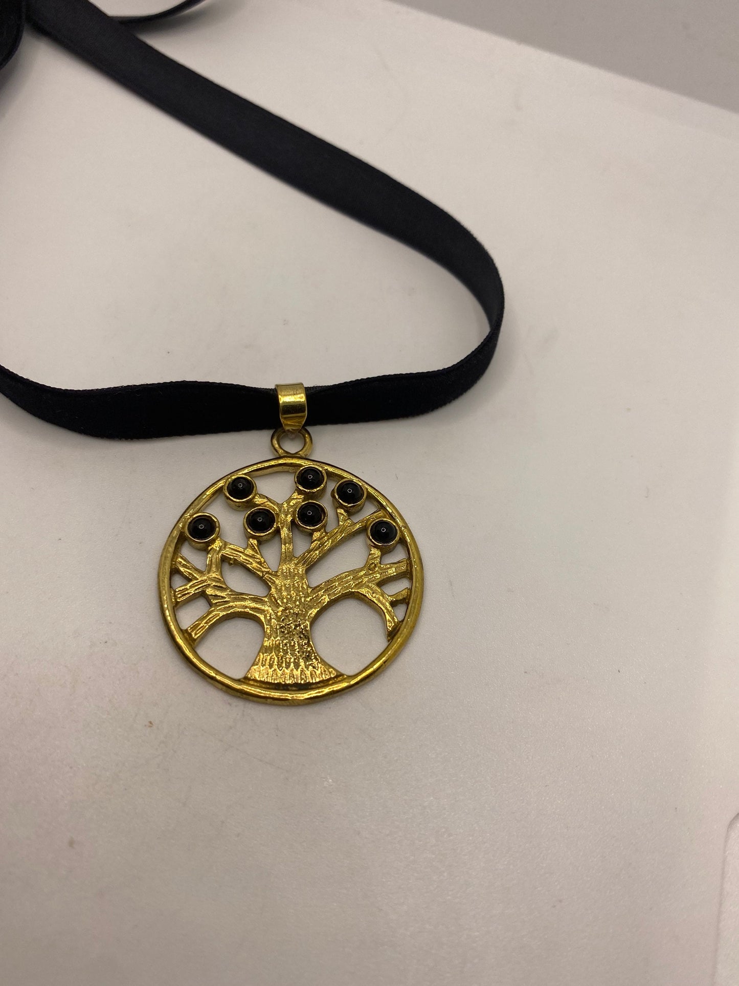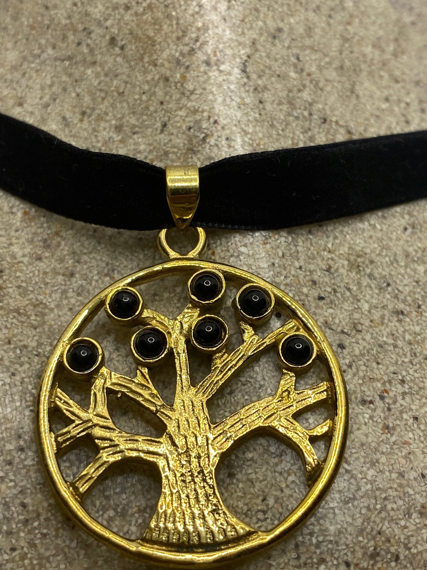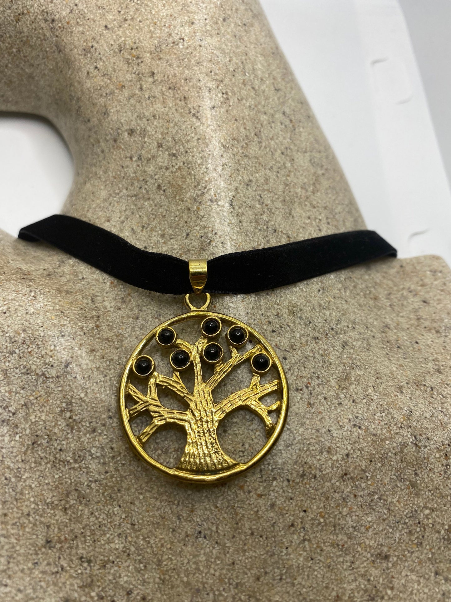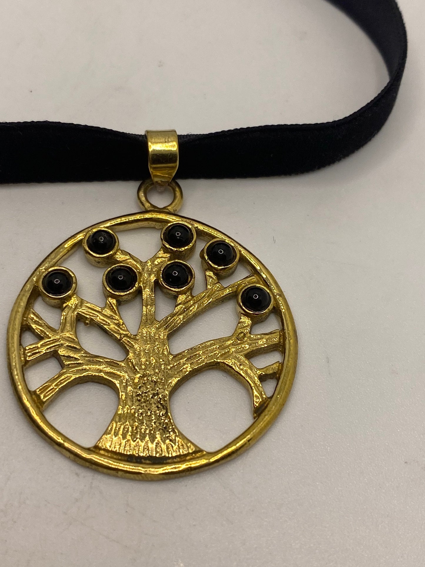 Vintage Tree of Life Onyx Bronze Black Velvet Choker Necklace.