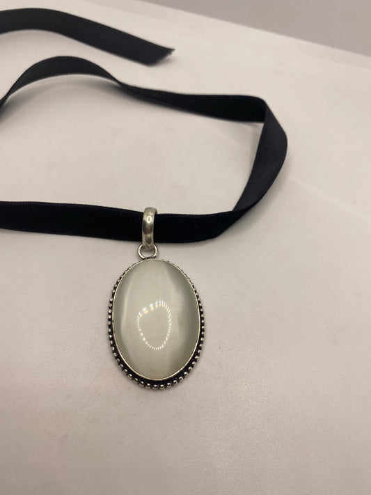 Vintage White Cats Eye Glass Antique Black Velvet Ribbon Choker Necklace