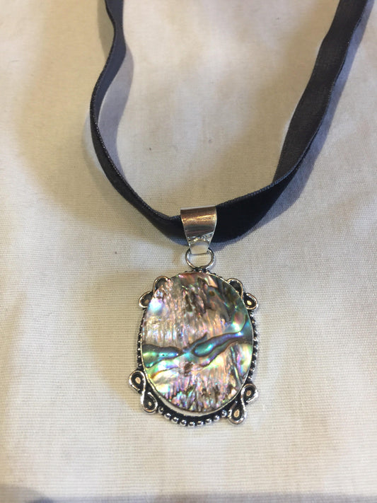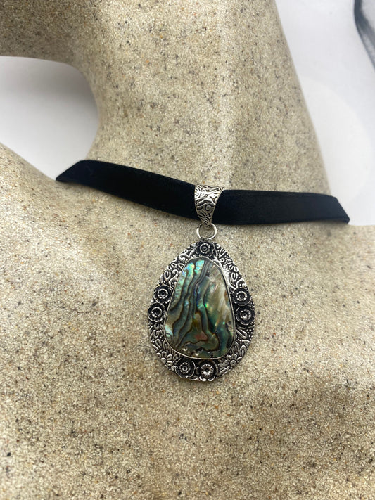 Vintage Abalone Choker Antique 925 Sterling Silver Pin Pendant Necklace