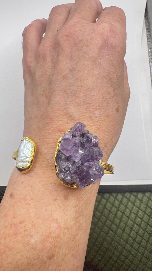 Vintage Pearl Amethyst Cuff Bangle Bracelet Golden 925 Sterling Silver