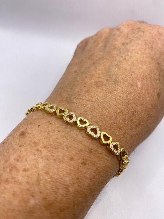Vintage Heart White Sapphire Golden 925 Sterling Silver Tennis Bracelet