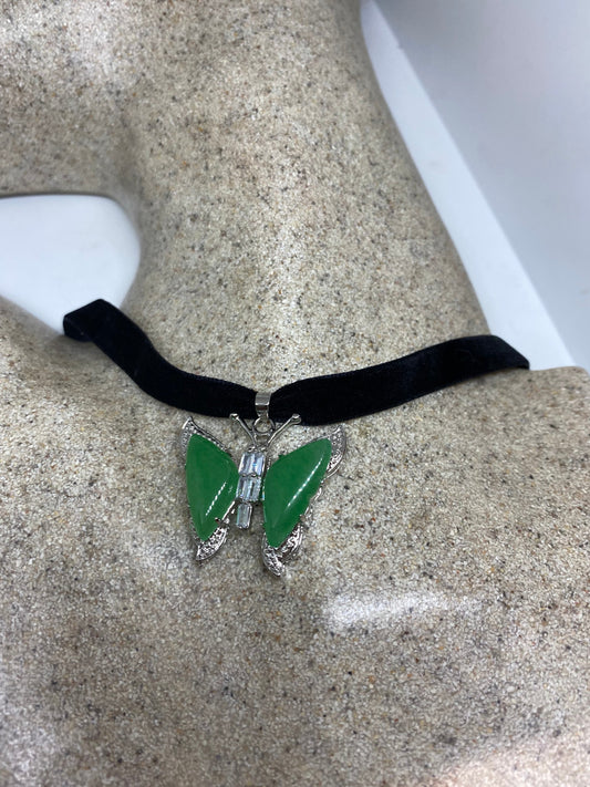 Vinate Green Jade Silver Finish Butterfy Necklace