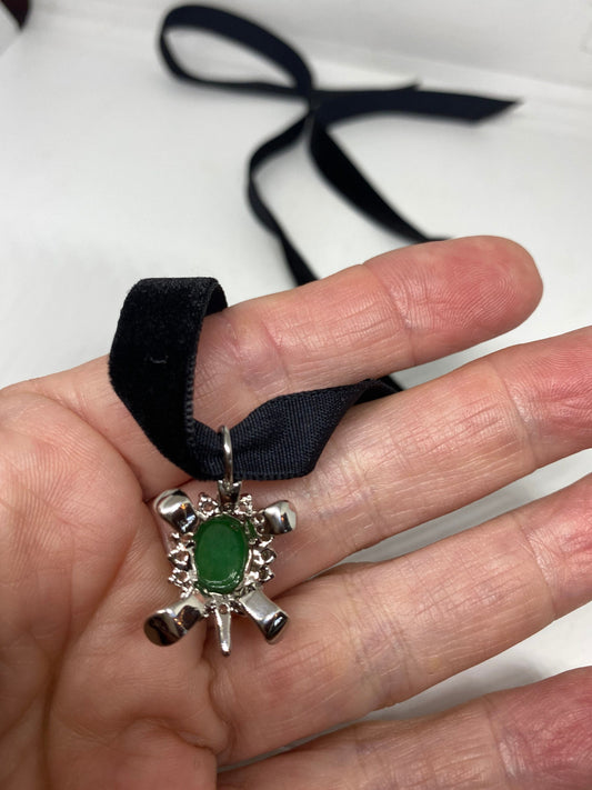 Vintage Green Jade Flower Choker Silver Finish Necklace Pendant