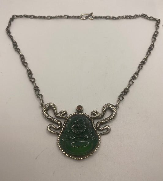 Vintage 925 Sterling Silver Green Jade Buddha Snake Pendant Choker Necklace