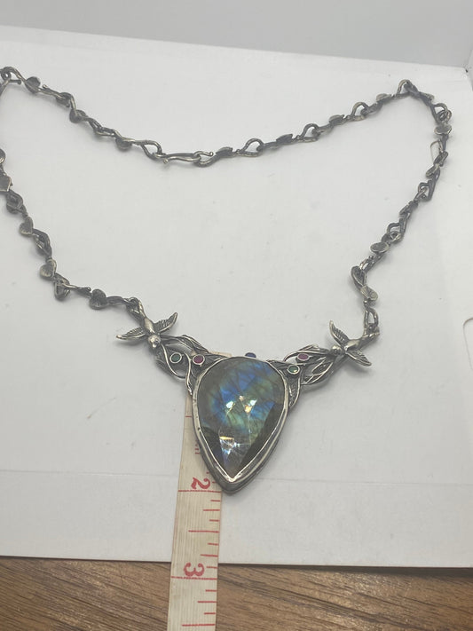 Vintage 925 Sterling Silver Blue Labradorite Bird Vine Pendant Choker Necklace