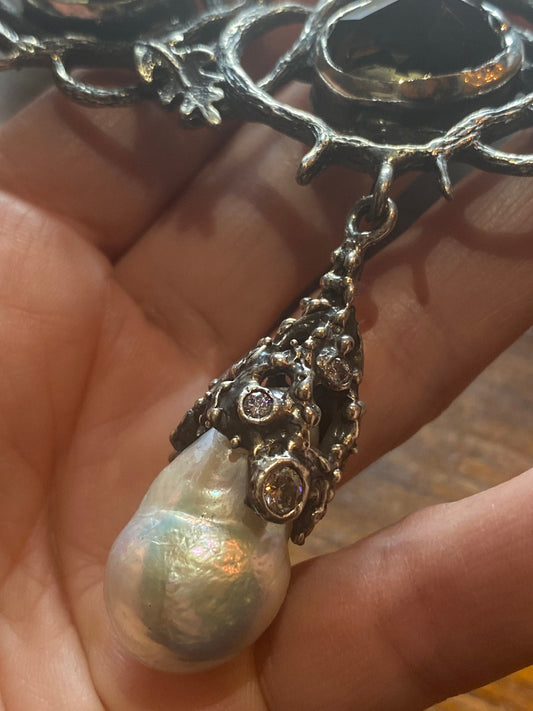 Vintage 925 Sterling Silver Brown Smoky Topaz Pearl Vine Pendant Choker Necklace