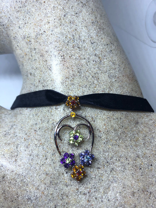 Vintage Handmade 925 Sterling Silver Genuine Mixed Colored Gemstone Antique Pendant Necklace