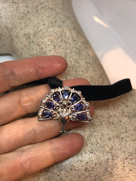 Vintage Blue Iolite Peacock Choker 925 Sterling Silver Necklace pin