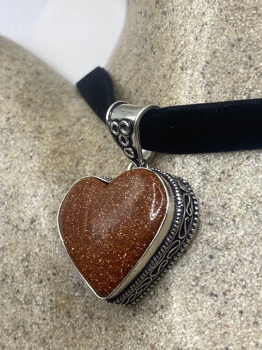 Vintage Golden Sandstone Heart Choker Goldstone Silver Necklace