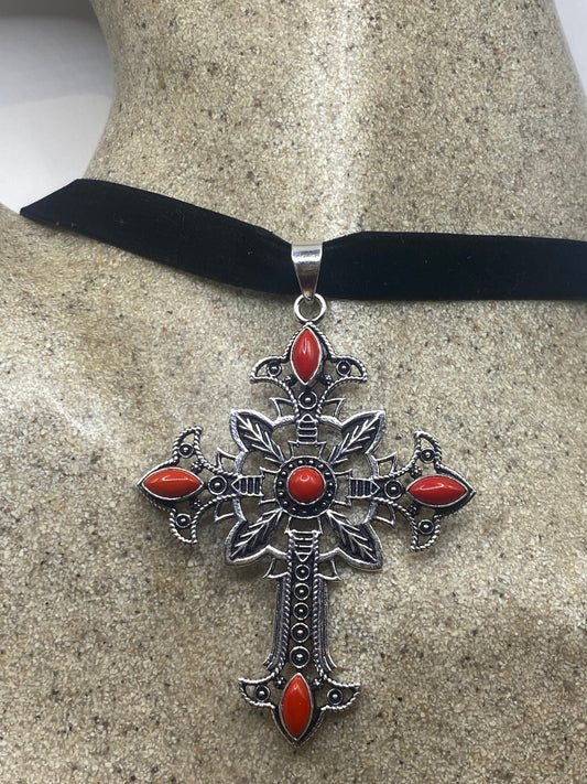 Vintage Red Coral Cross Choker Black Velvet Necklace.
