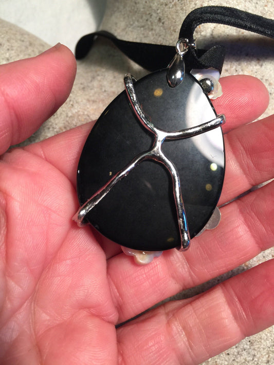 Vintage Genuine Mother of Pearl Flowers 925 Sterling Silver Black Onyx Dangle Pendant Necklace Pendant
