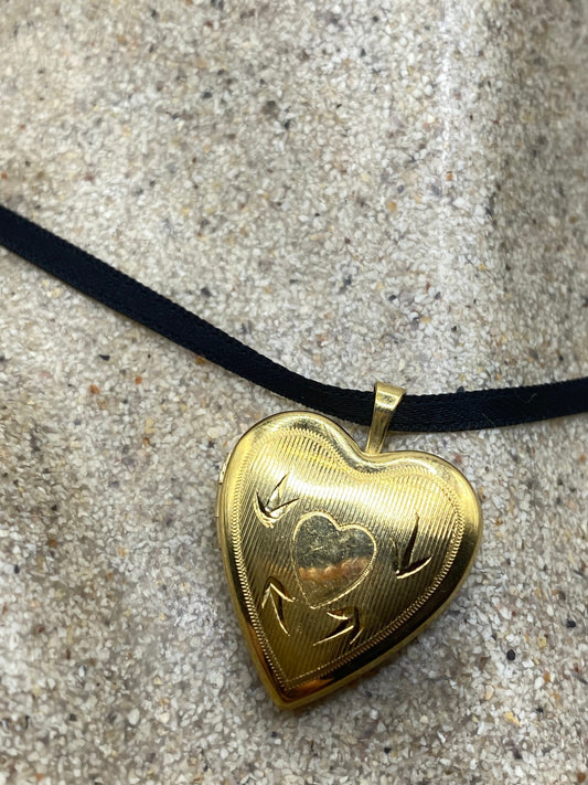 Vintage Gold Locket | Tiny Heart 9k Gold Filled Pendant Photo Memory Charm Engraved Arrows Hearts | Choker Necklace