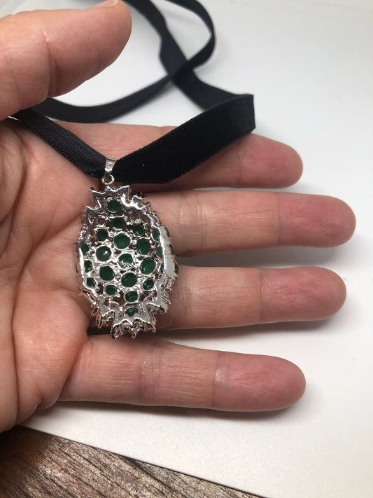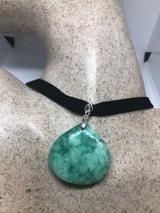 Vintage Green Jade Choker Silver Finish Necklace Pendant