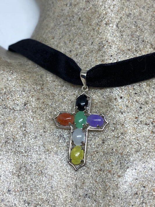Vintage Fun Jade and Mixed Gemstone Choker 925 Sterling Silver Cross Pendant Necklace