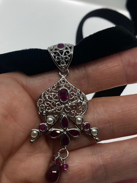 Vintage Ruby Choker 925 Sterling Silver Pearl Antique Pendant Necklace
