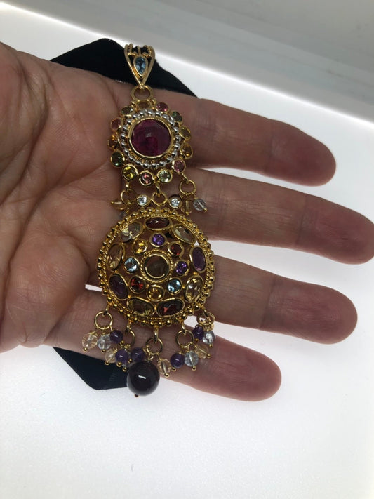 Vintage Handmade Golden 925 Sterling Silver Genuine Mixed Gemstone tourmaline Antique Pendant Necklace