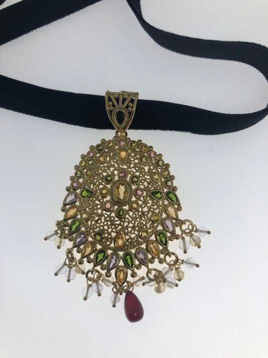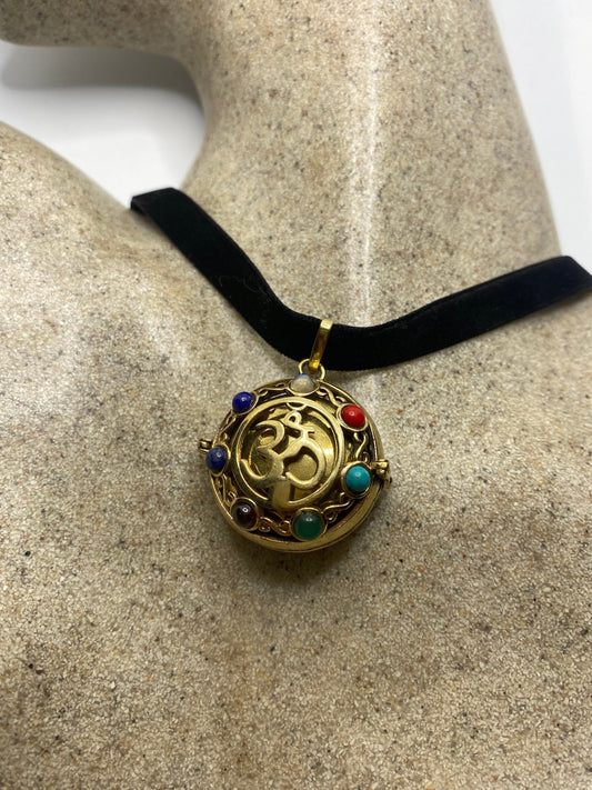 Vintage Ohm Shanti Chakra Stones Bronze Velvet Choker Necklace.