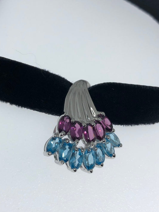 Vintage Handmade Golden 925 Sterling Silver Genuine tourmaline Mixed Gemstone and Blue Topaz Antique Pendant Necklace