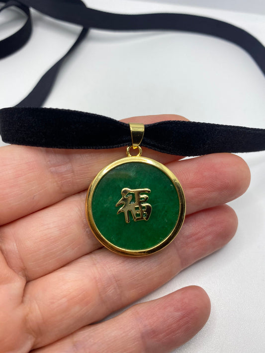 Vintage Green Jade Choker Gold Finish Necklace Pendant