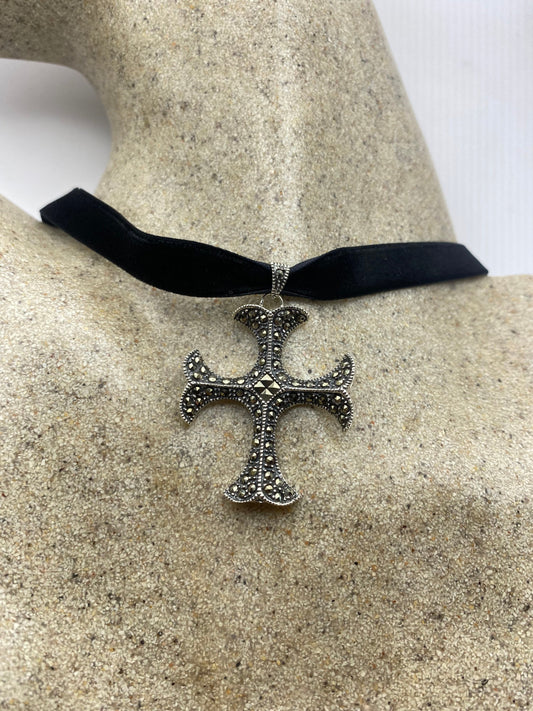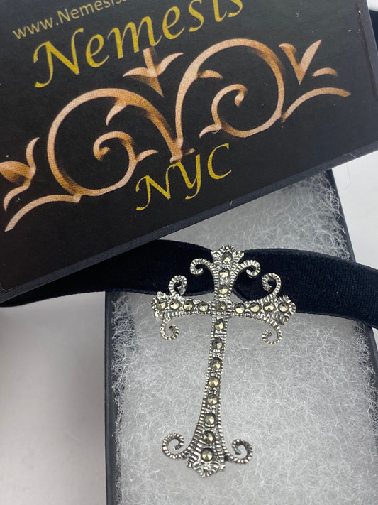 Vintage Marcasite Cross Choker 925 Sterling Silver Pendant Necklace