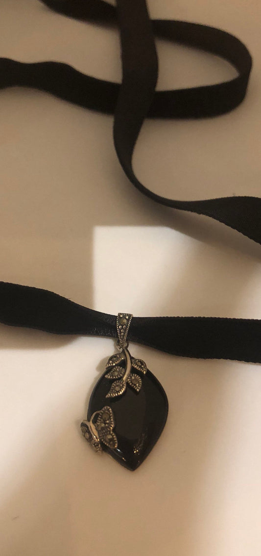 Vintage Marcasite 925 Sterling Silver Black Onyx Choker Dangle Pendant Necklace