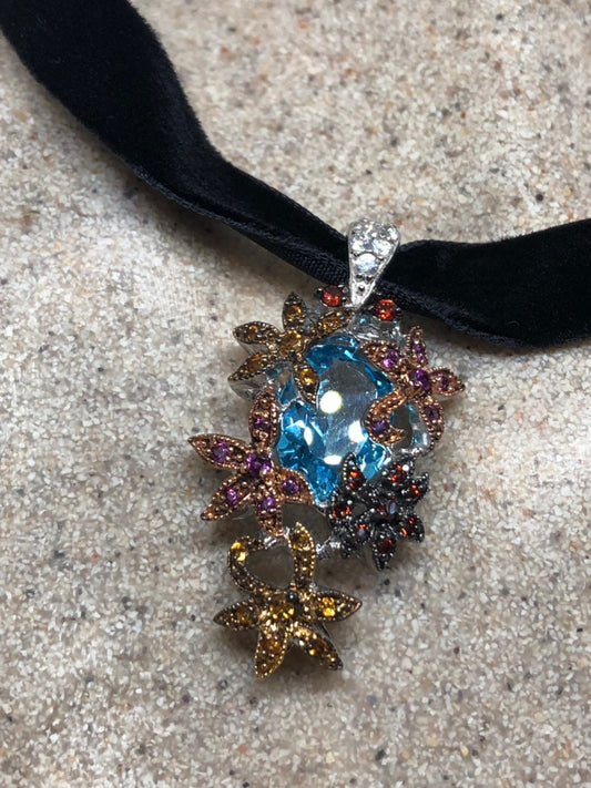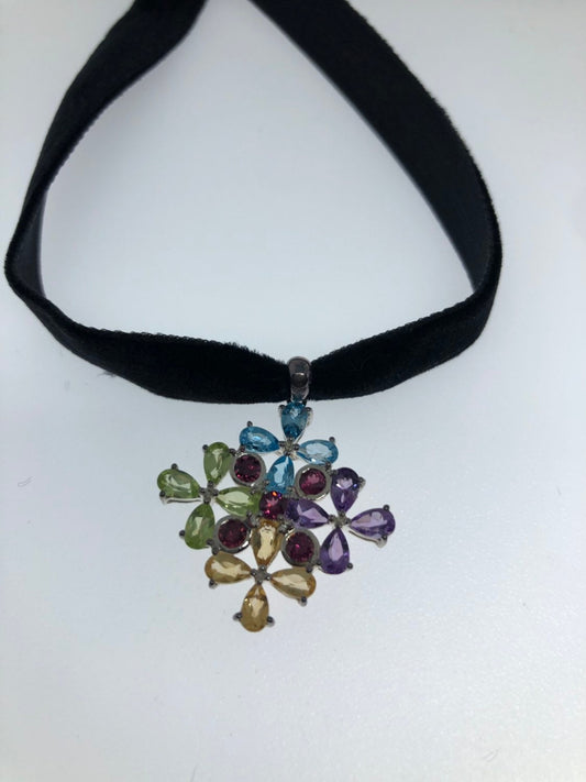 Vintage Handmade 925 Sterling Silver Genuine Mixed Gemstone and Blue Topaz Antique Pendant Necklace
