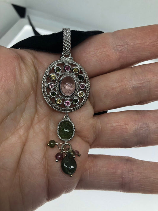 Vintage Handmade 925 Sterling Silver Mixed tourmaline Gemstone Antique Pendant Necklace