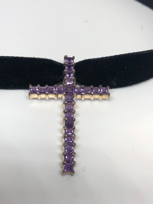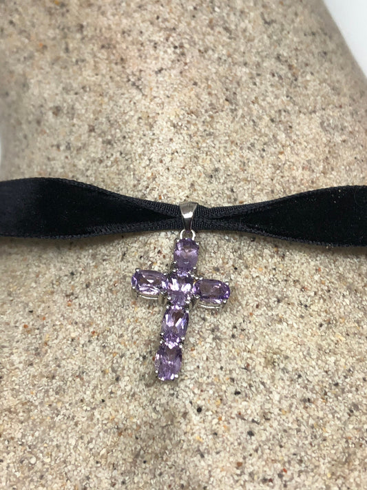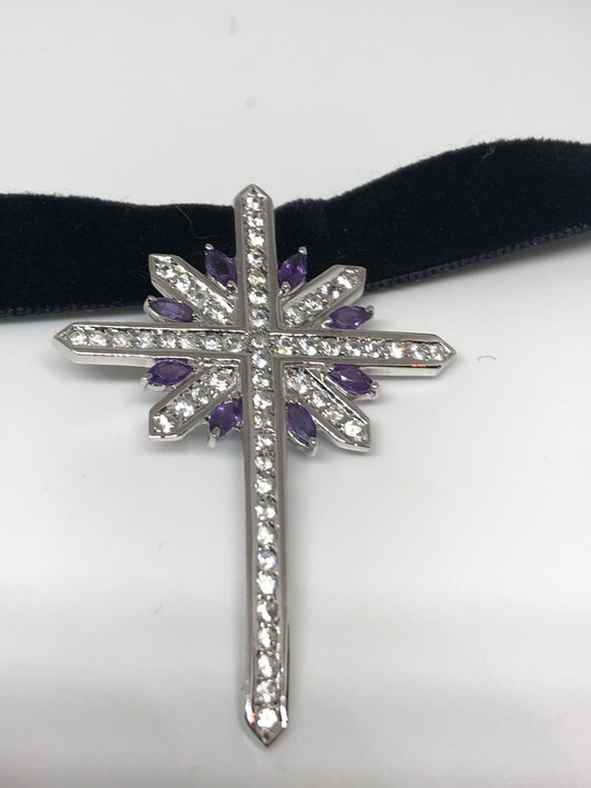 Vintage CROSS Choker 925 Sterling Silver White Sapphire Amethyst Pendant Necklace