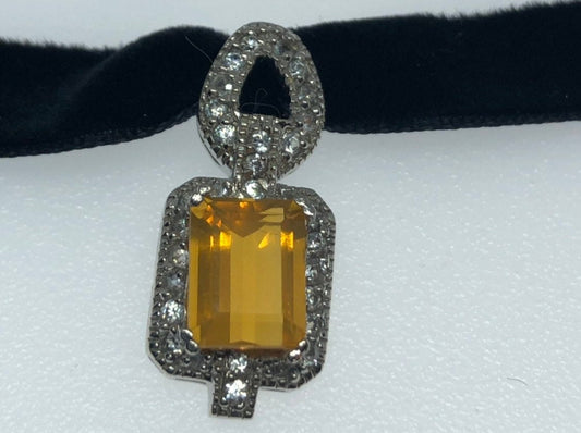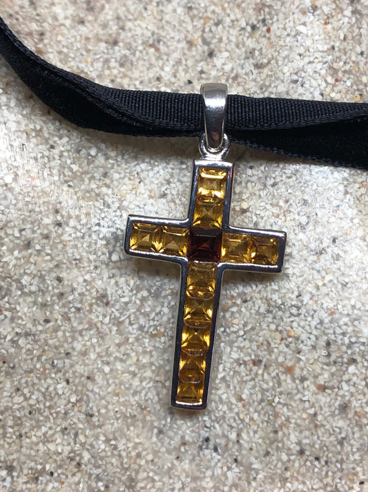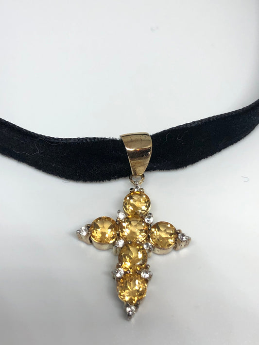 Vintage Gold Citrine Cross 925 Sterling Silver Pendant Choker Necklace