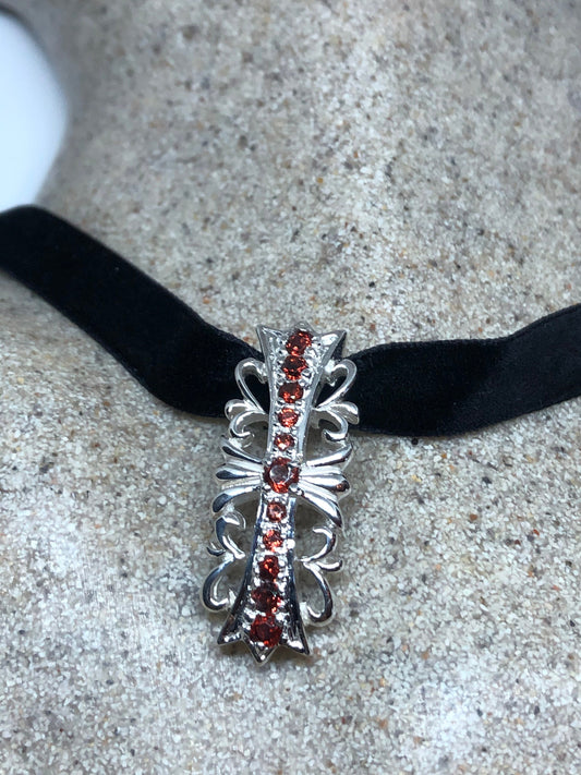 Vintage Red Garnet Cross Choker Necklace 925 Sterling Silver Pendant