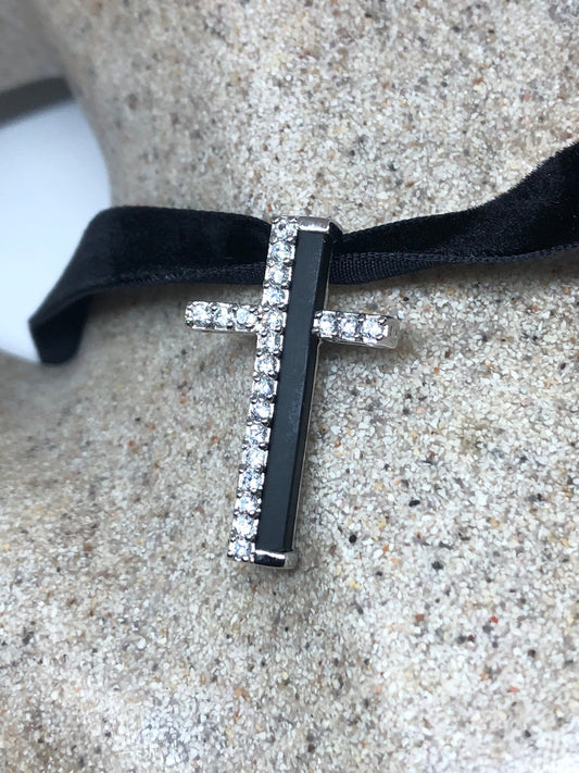 Vintage CROSS Choker 925 Sterling Silver White Sapphire Pendant Necklace