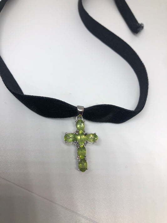 Vintage Silver Genuine Peridot Cross Choker Necklace Pendant